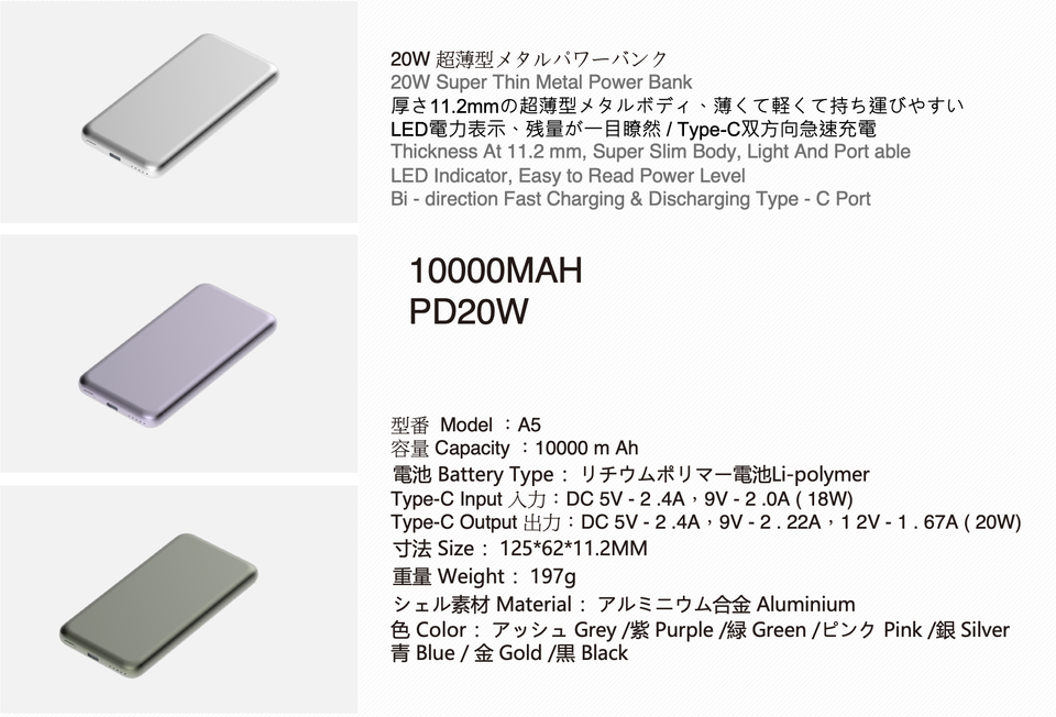 Type-C Output:DC 5V-2.4A,9V-2.22A,12V-1.67A(20W)