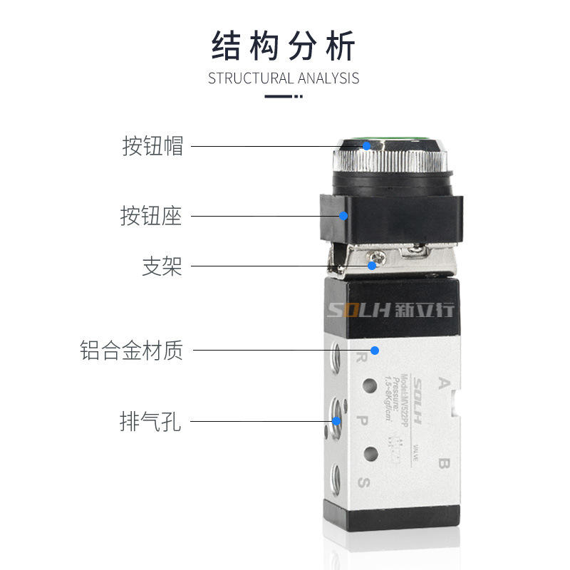 วาล์วควบคุมแบบกลไกด้วยมือ MV522R แบบปุ่มกดกลมขนาดใหญ่ 2 ตำแหน่ง 5 ทาง พร้อมโครงสร้างควบคุมแบบลูกกลิ้ง PP ที่สามารถล็อคได้