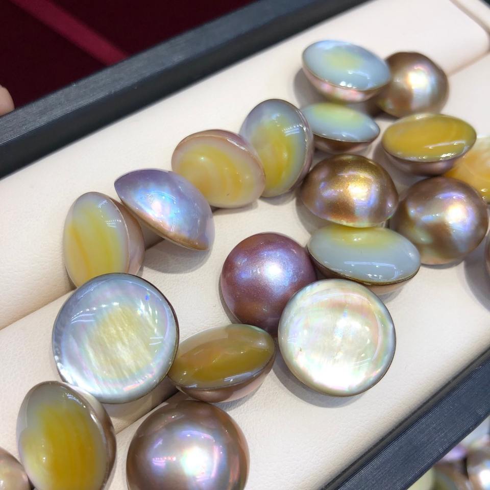 ไข่มุกมาเบะสีม่วงทองจากทะเลเมเบอิ เกรด AAA รูปทรงกลม ไข่มุกเลี้ยงแบบปล่อยปลูก จำหน่ายเป็นชุดเล็กๆ สำหรับการซื้อจำนวนมาก