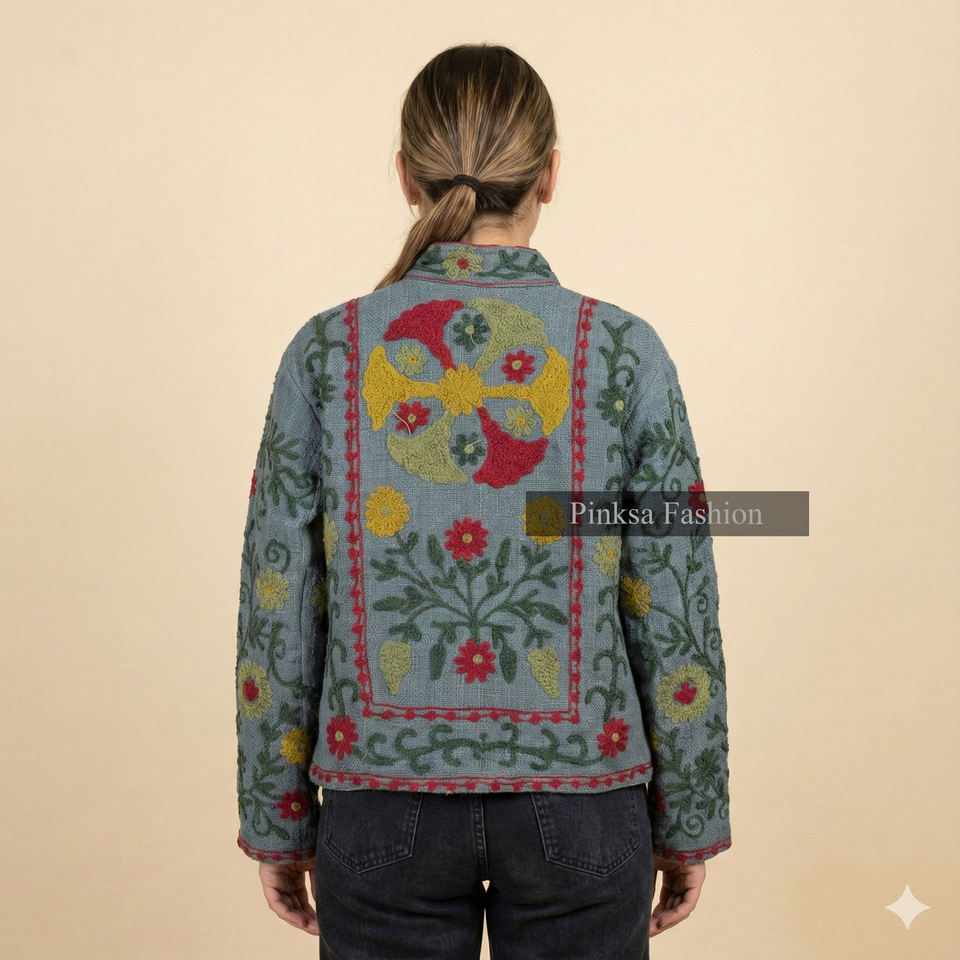 เสื้อแจ็คเก็ตผ้ากำมะหยี่ปักลายซูซานี ผลิตจากผ้าฝ้ายอินเดียที่เป็นมิตรต่อสิ่งแวดล้อม สำหรับผู้หญิง ดีไซน์หรูหรา | เสื้อคลุมสไตล์โบฮีเมียน