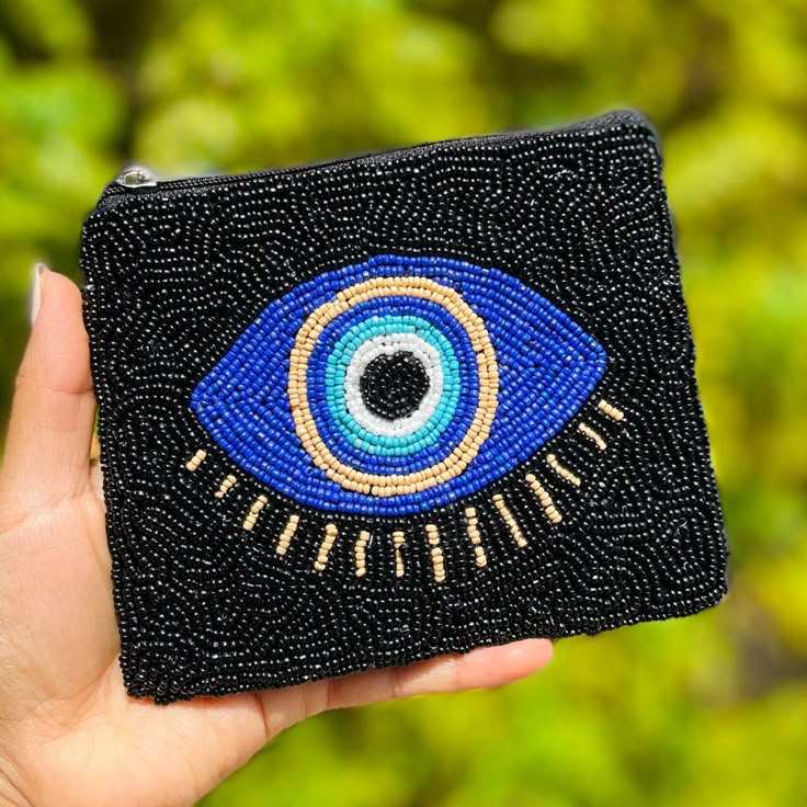 กระเป๋าใส่เหรียญลูกปัดลายตาปีศาจ ผลิตในอินเดีย กระเป๋าซิปเม็ดลูกปัดสีดำ กระเป๋าสตางค์ลายตาสีฟ้า ที่ใส่บัตรลูกปัดแก้ว กระเป๋าใส่เงินขนาดเล็ก
