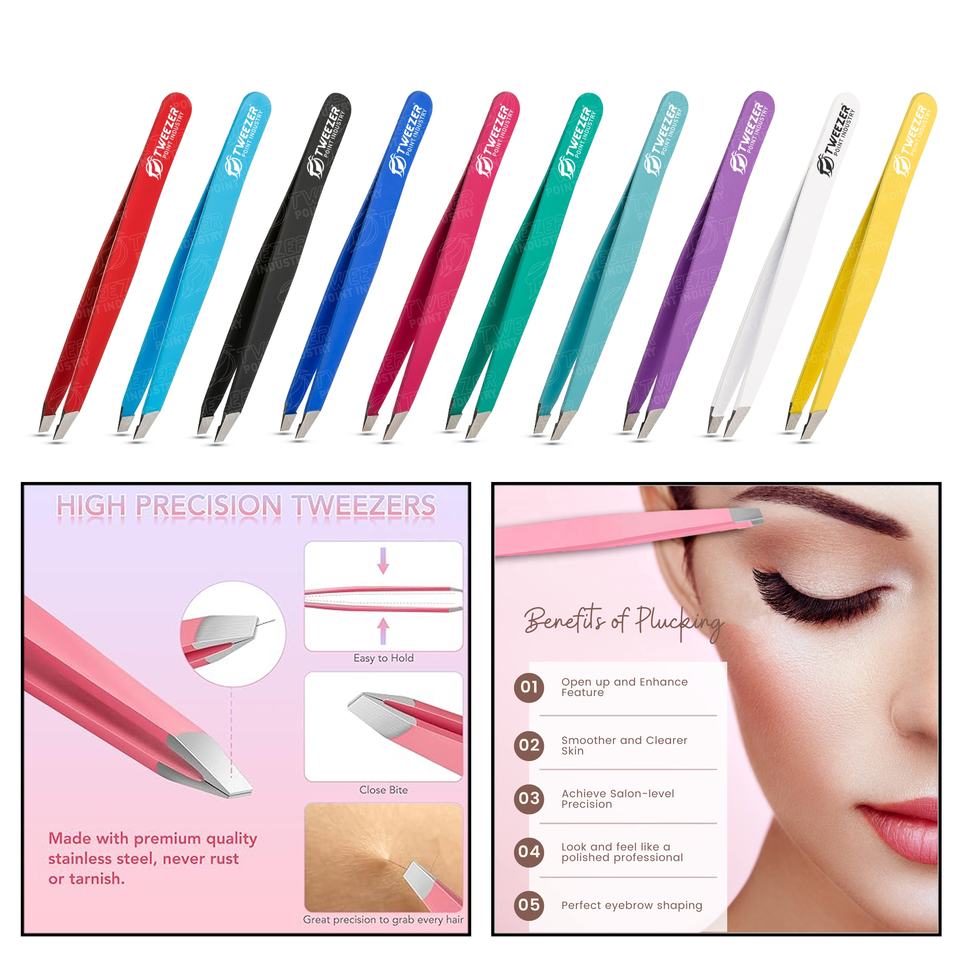 ชุดแหนบคิ้วสแตนเลสคุณภาพสูง ทนทาน พร้อมซองเก็บ หรูหรา พกพาสะดวก สำหรับการดูแลขนคิ้วด้วยตนเอง พร้อมโลโก้