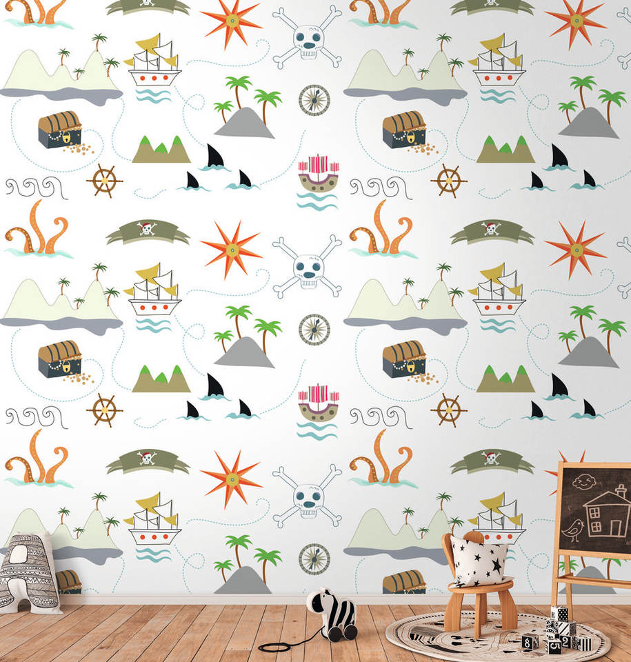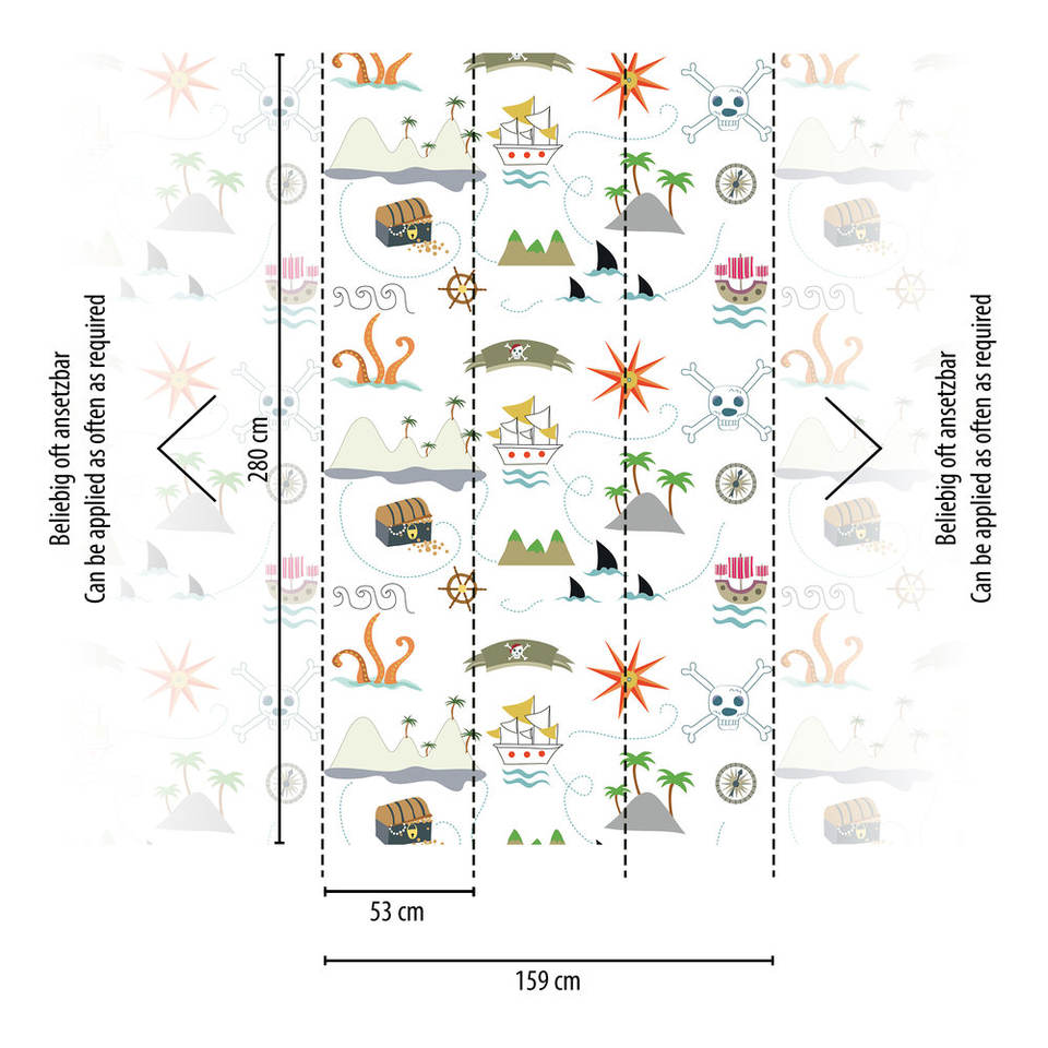 ภาพจิตรกรรมฝาผนังวอลล์เปเปอร์ทำในเยอรมนีภาพจิตรกรรมฝาผนังห้องเด็กครีมสีเขียวเทาไม่ทอไวนิลติดผนังโจรสลัดสำหรับโรงแรม-2,80x1,59เมตร