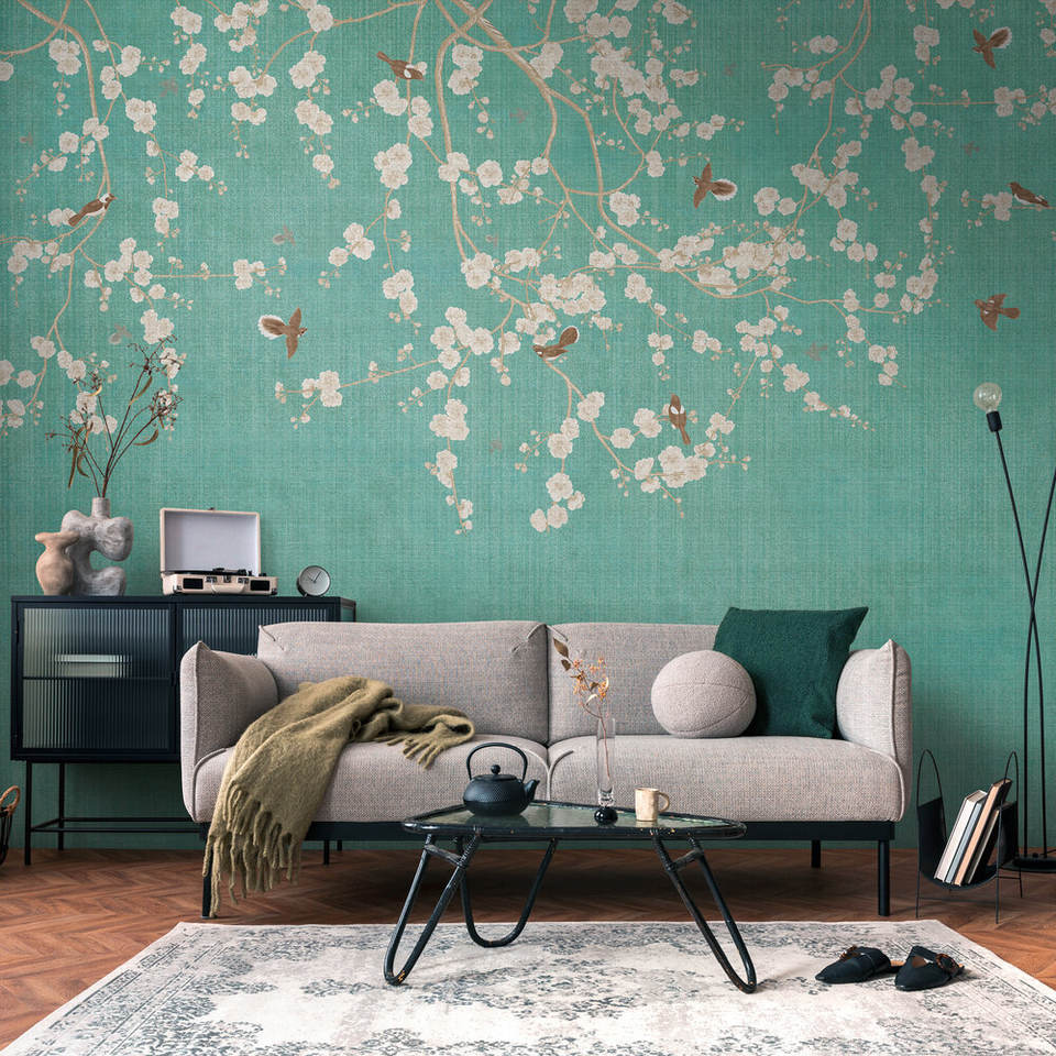 ผลิตในเยอรมนี วอลเปเปอร์ไวนิลลายดอกไม้สีฟ้าครีม แบบไม่ทอ ขนาด 3.71x2.80 เมตร ลอกออกได้ ทนแสง เหมาะสำหรับห้องนอน โรงพยาบาล ห้างสรรพสินค้า