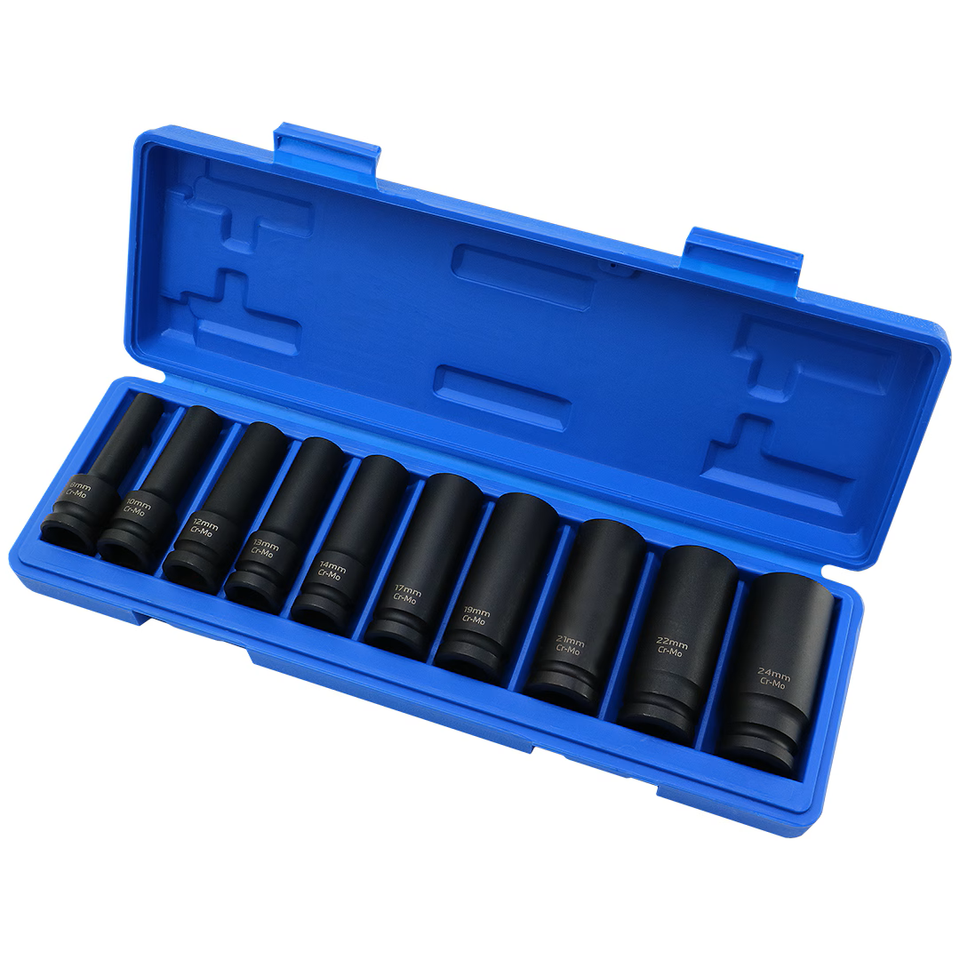 เราผลิตสินค้าแบรนด์ของคุณให้เป็น "ผลิตในไต้หวัน" ชุดบล็อกขันน็อตแบบลึก 10 ชิ้น ผลิตจากแมงกานีสฟอสเฟต Cr-Mo ขนาด 1/2 นิ้ว พร้อมกล่องกันกระแทก รับประกัน 3 ปี (OEM)