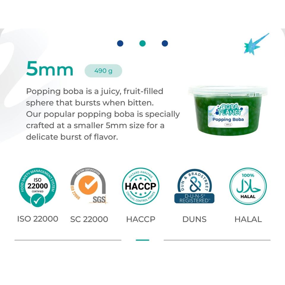 โบบาแพลนเน็ต ไข่มุกป๊อปปิ้งไส้ผลไม้ 5 มม. รสผลไม้ในขวด (490 กรัม) สำหรับร้านชา