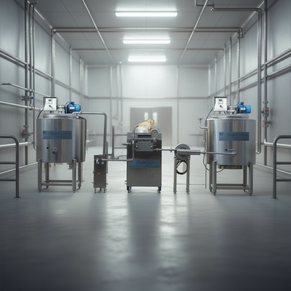 สายการผลิตไอศกรีมอุตสาหกรรมมาดูลี เอ็นเตอร์ไพรส์ พร้อมถังบ่ม ถังผสมแบบโฮโมจีไนเซอร์ และเครื่องทำไอศกรีมแบบแบทช์ฟรีซเซอร์ สำหรับโรงงานผลิตนม