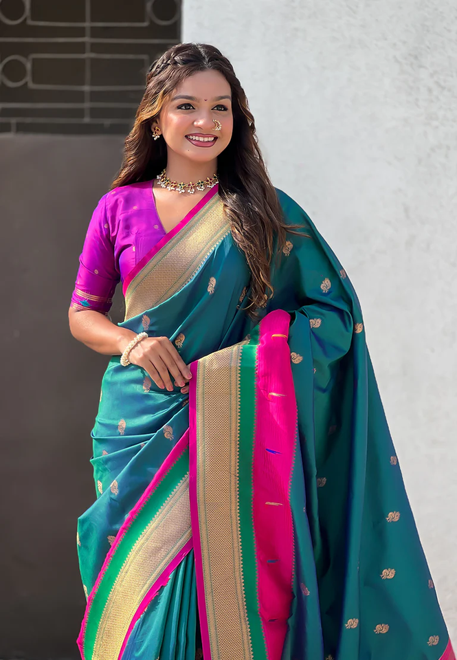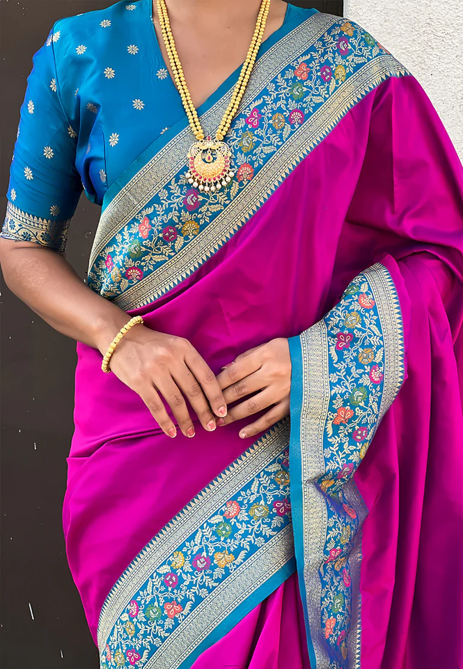 ผ้าไหมสีม่วงแดงสำหรับงานกาล่า ประดับด้วยลายปาธานีพาลลูและลายคาดิยาลซารีที่สวยงามอย่างงดงาม ให้ความสง่างามที่โดดเด่น เหมาะสำหรับงานปาร์ตี้