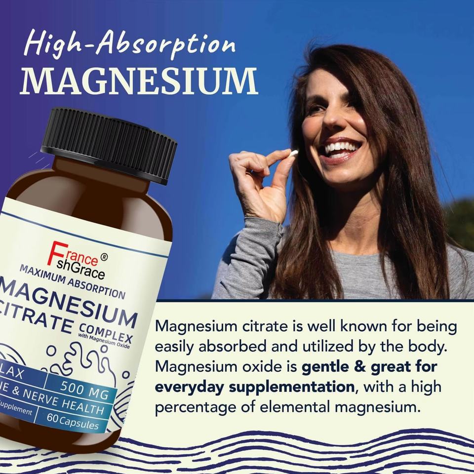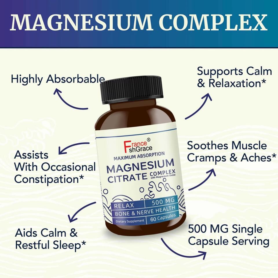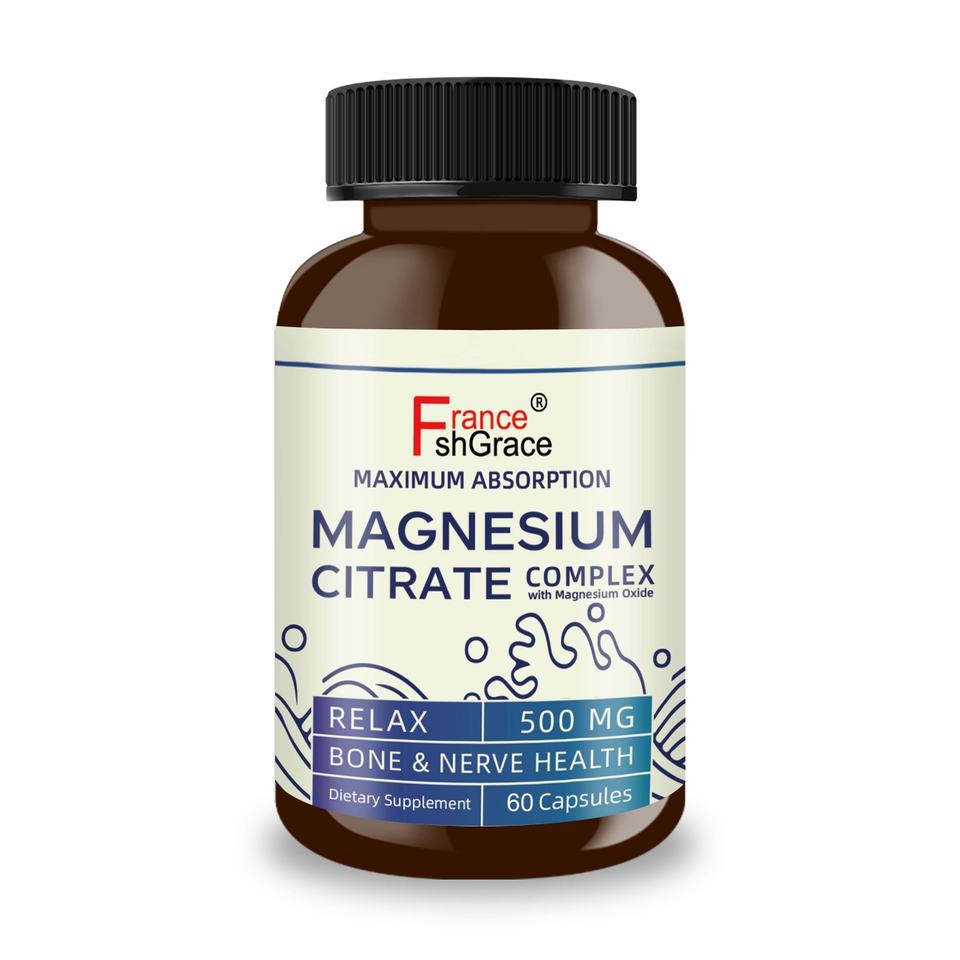 แมกนีเซียมซิเตรต 500 มก. สำหรับการผ่อนคลาย บรรเทาอาการท้องผูก และช่วยในการย่อยอาหาร แมกนีเซียมเสริมที่มีการดูดซึมสูง