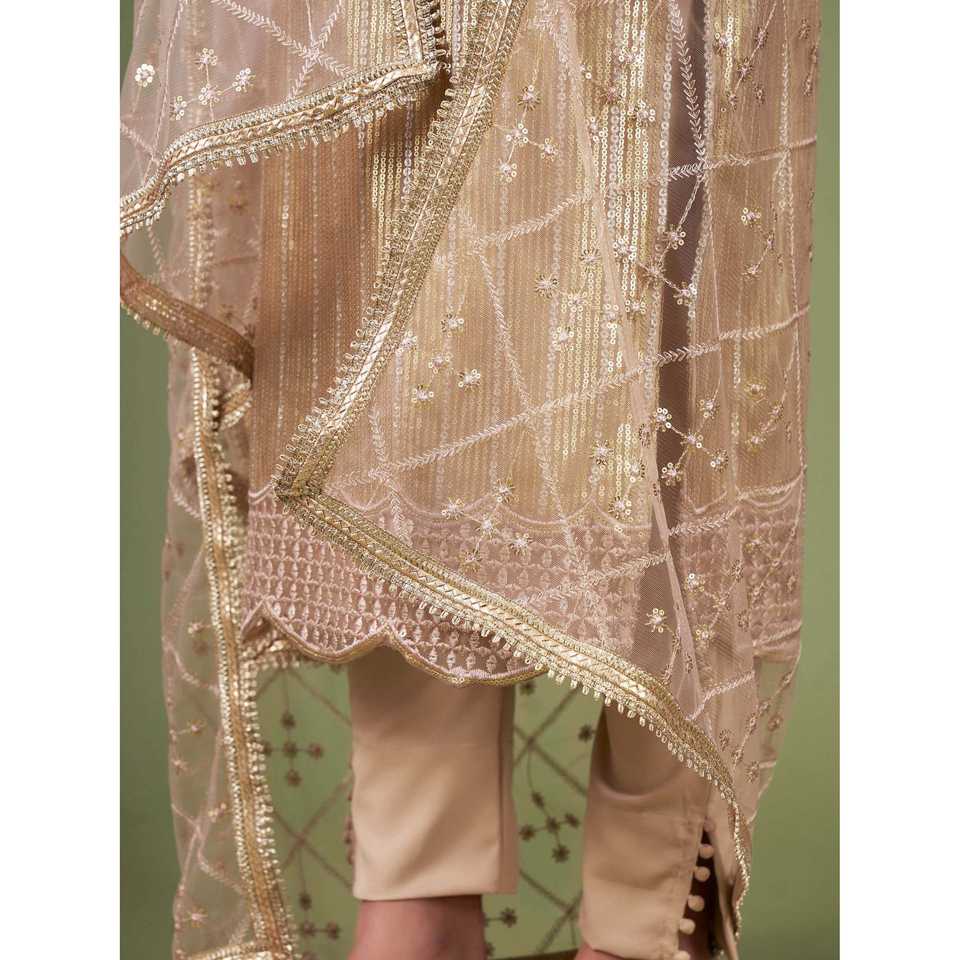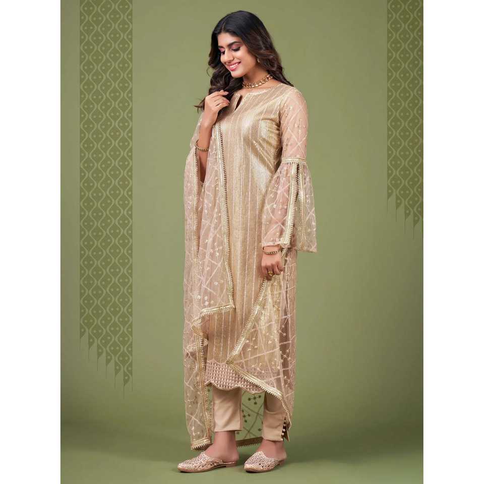 ชุดสตรีผ้าตาข่ายปักเลื่อมสีเบจสวยงามสำหรับงานอีเว้นท์-ชุดสلوار