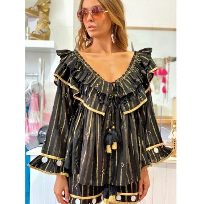 เสื้อเบลาส์ & กางเกงแต่งพู่สำหรับผู้หญิงตัวบนและกางเกงขาสั้นผ้าคอตตอนสไตล์โบฮีเมียนสวยงามสีดำหนา
