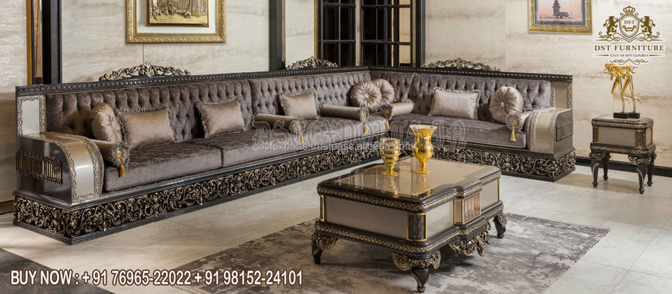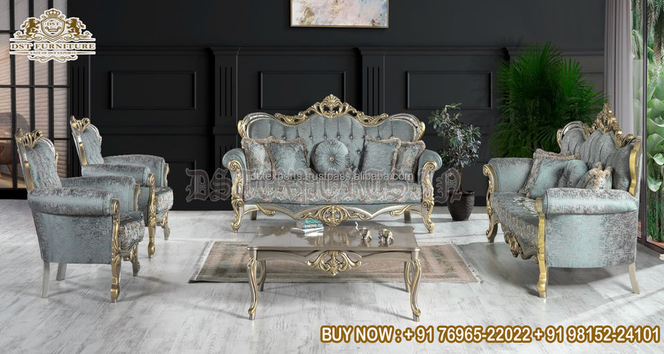 ชุดโซฟาไม้สักสไตล์ฝรั่งเศสสุดหรูแกะสลักลายใบไม้สีทองเงา
