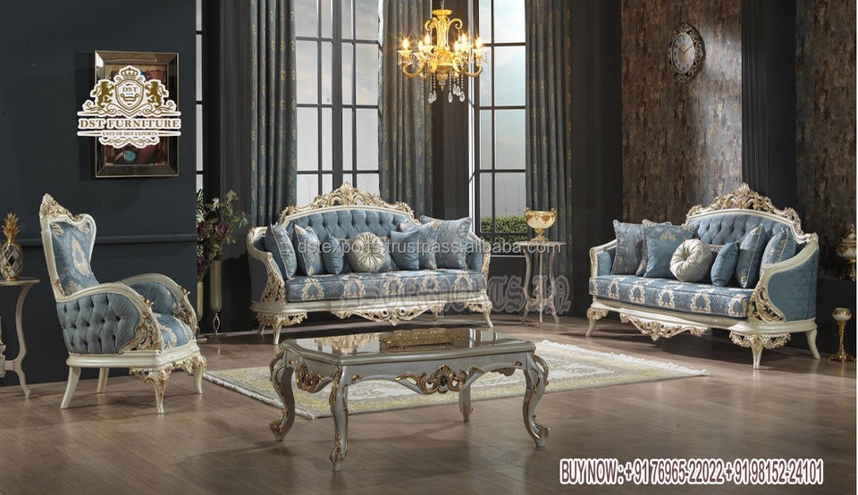 Maharaja ชุดโซฟา8ที่นั่งแกะสลักขนาดใหญ่,ชุดโซฟาห้องนั่งเล่นแกะสลักสีทองหรูหราชุดวาดภาพเสร็จสิ้นสีทอง