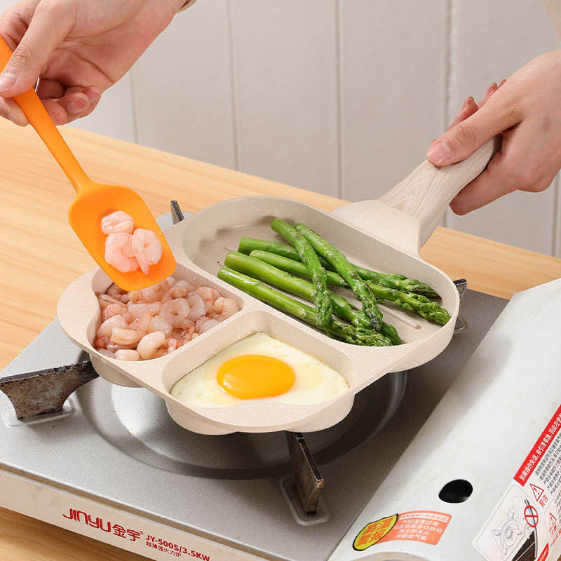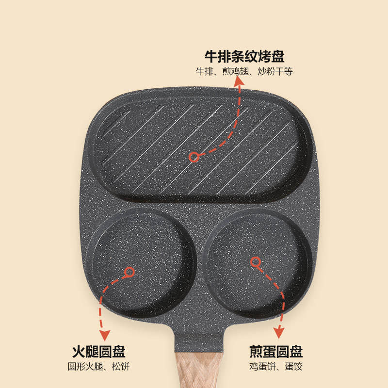 กระทะหินไมแฟนสามรู กระทะสเต็กทรงสี่เหลี่ยมแบบไม่ติดกระทะ กระทะทำอาหารเช้าสำหรับใช้ในครัวเรือน ดีไซน์รูปหัวใจ