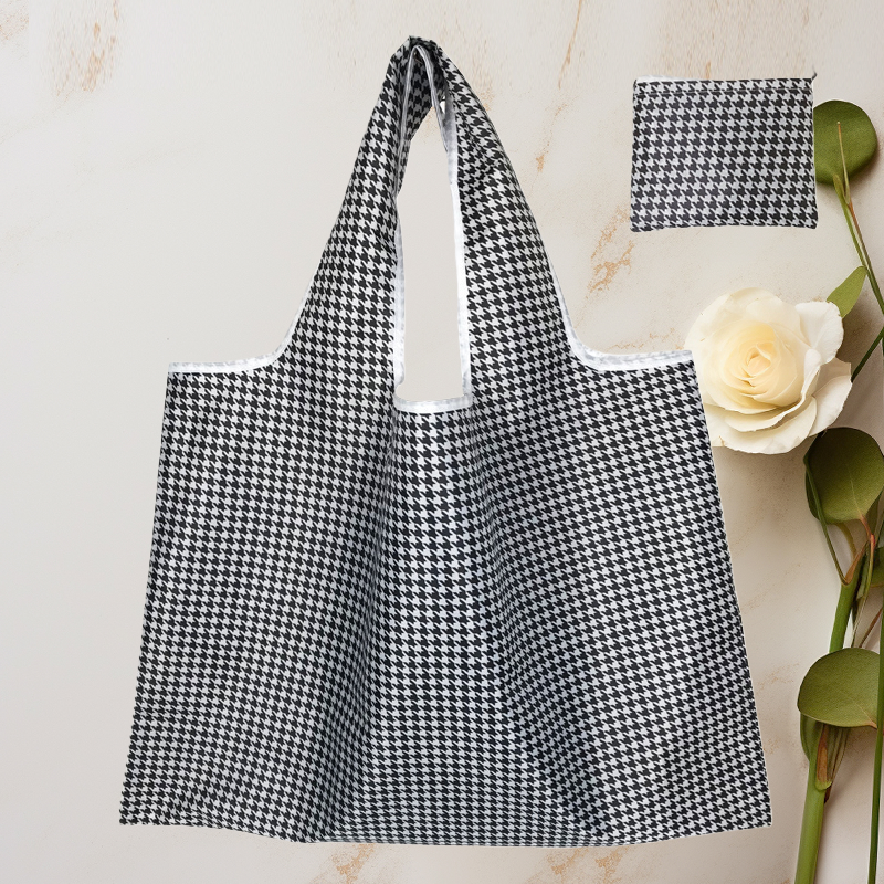 ถุงช้อปปิ้งพับได้แบบรีไซเคิล ผลิตจากโพลีเอสเตอร์ RPET เป็นมิตรกับสิ่งแวดล้อม ปรับแต่งได้ พร้อมหูหิ้วแบบยาวและฝาปิดแม่เหล็ก