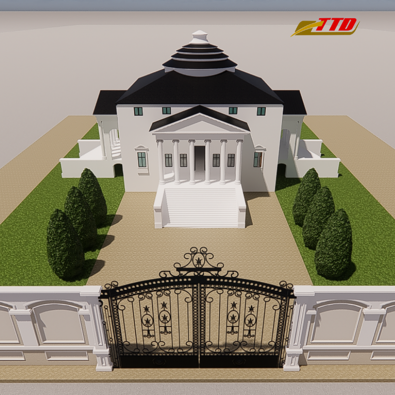ประตูหลักออกแบบสำหรับบ้านที่ทำในเวียดนามด้วยวัสดุท้องถิ่นร้อยละ100และงานฝีมือเหล็กดัดเหนือกาลเวลา