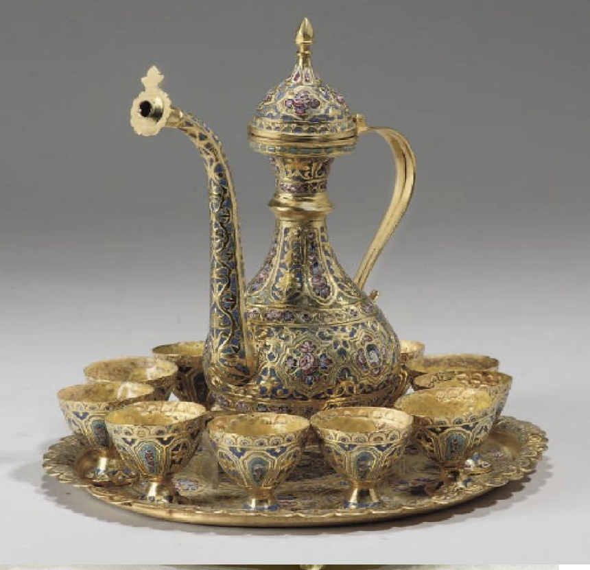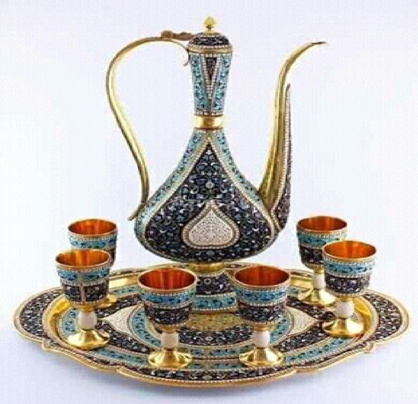 เหยือกทองคำทรงลูกแพร์ทรงสง่างาม พร้อมลายโมเสกสีน้ำเงิน และถ้วยที่เข้าชุดกัน มีจำหน่ายในราคาขายส่ง