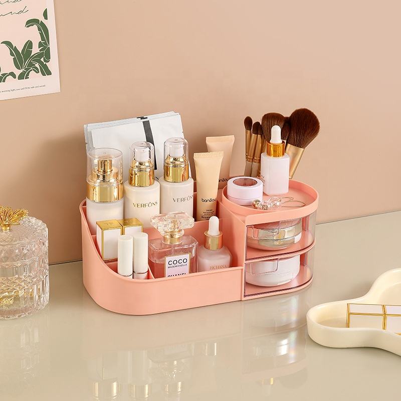 แต่งหน้าออแกไนเซอร์ยืนห้องน้ําจอแสดงผลกรณีเดสก์ท็อปผลิตภัณฑ์ดูแลผิวผู้ถือเครื่องสําอางแร็คแต่งหน้ากล่องเก็บ LED กระจก