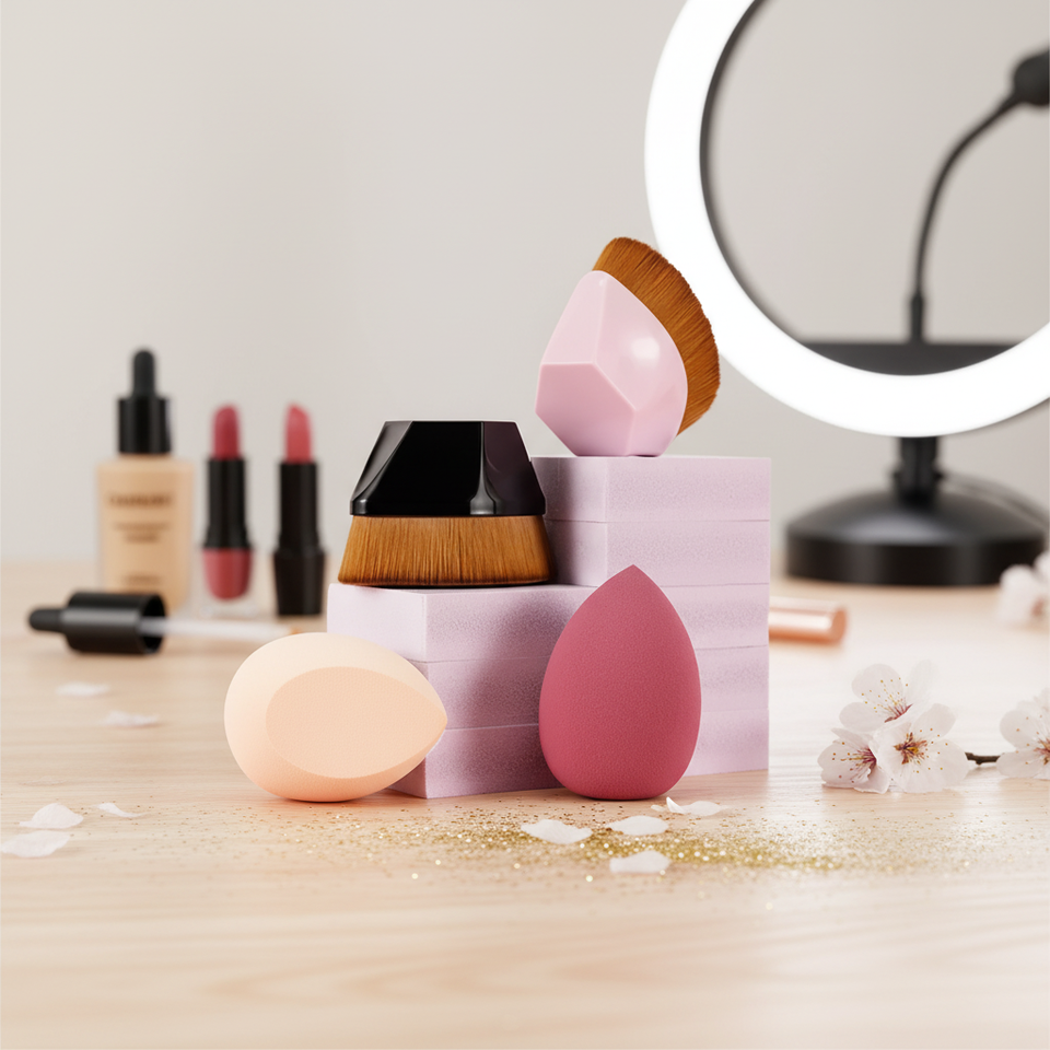 ชุดแปรงแต่งหน้าพร้อมฟองน้ำ 4 ชิ้น ขนสังเคราะห์สีเบจ สำหรับแต่งตา แต่งหน้า ใช้กับใบหน้า ด้ามพลาสติก หัวแปรงทรงกลม ขนาด M