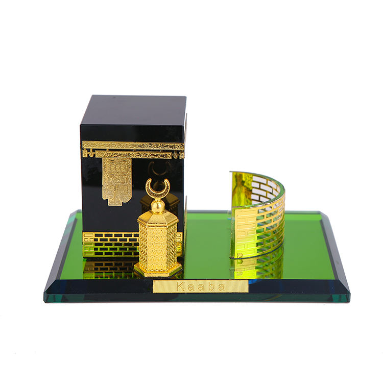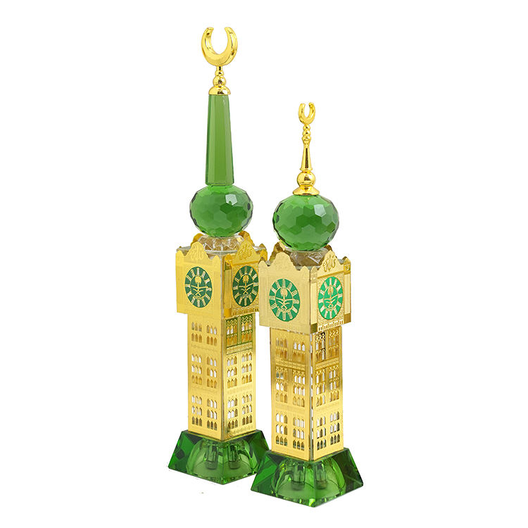 หอนาฬิกามักกะฮ์แกะสลักแบบกำหนดเอง ของตกแต่งแก้วคริสตัล K9 ของที่ระลึกอิสลาม สีเขียวทอง ของขวัญวันหยุด