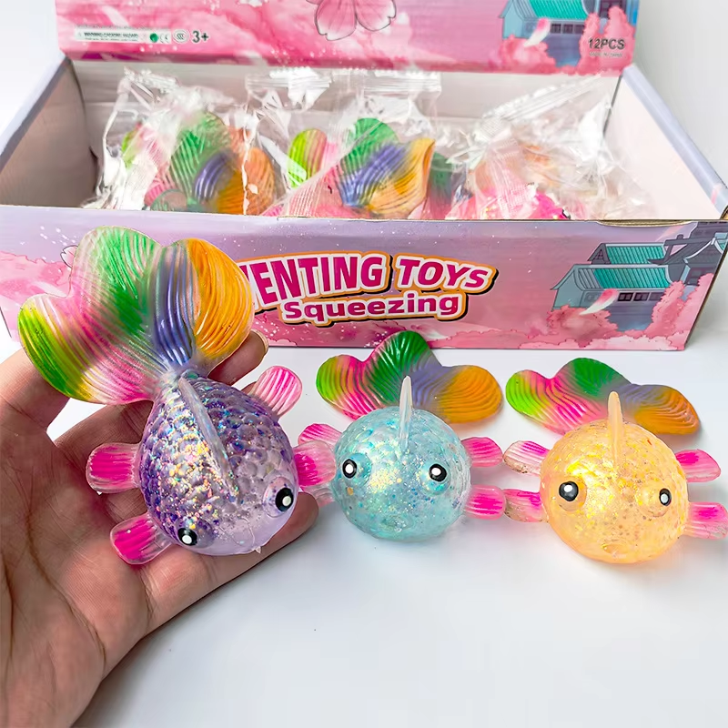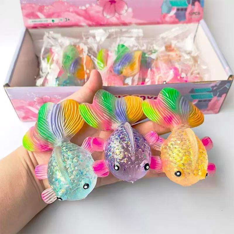 ของเล่นบีบคลายเครียด ปลาทองมอลโตส TPR แบบคืนตัวช้า กล่องระบายอากาศประดับเลื่อมออโรร่า