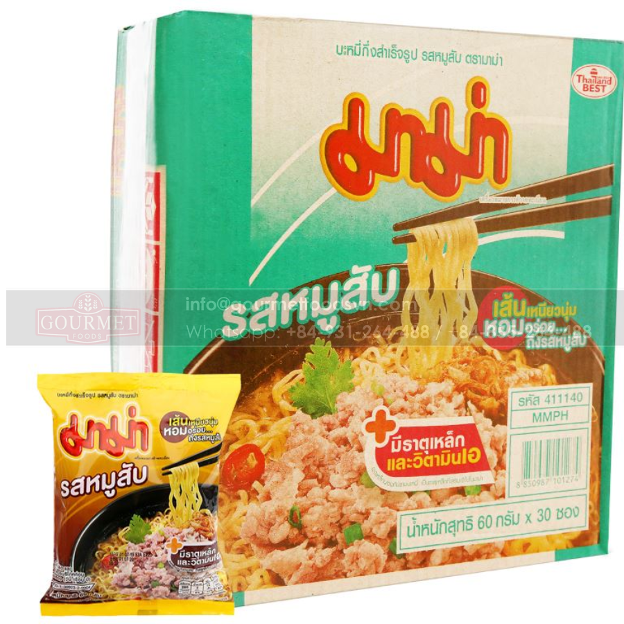 ชื่อผลิตภัณฑ์:มาม่าบะหมี่กึ่งสำเร็จรูปรสหมูสับขนาด60กรัม x 30ถุง x 6กล่อง