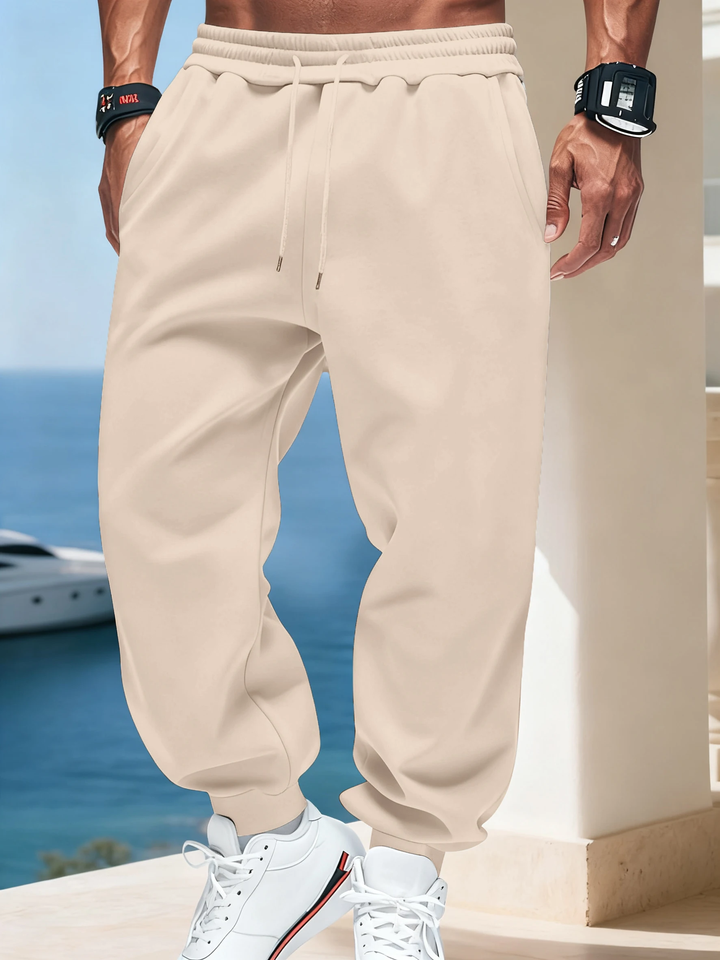 กางเกงวอร์มผ้าฟลีซสำหรับผู้ชาย ทรงลำลอง มีเชือกผูกเอว กางเกงขายาวใส่สบาย สไตล์สตรีทแฟชั่น มีกระเป๋า กางเกงทรงหลวมแบบพื้นฐาน
