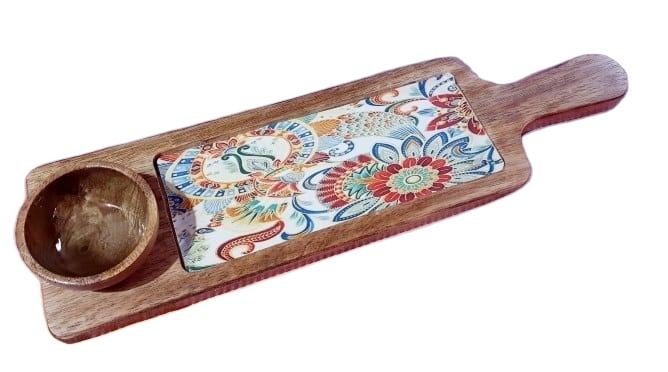 ถาดไม้มะม่วงเคลือบด้วยเรซิ่นพร้อมชามไม้ขนาดเล็กถาดเสิร์ฟทรงสี่เหลี่ยมผืนผ้าพิมพ์ลายดิจิทัลสำหรับสลัดผลไม้ทะเลทรายซอสอาหาร