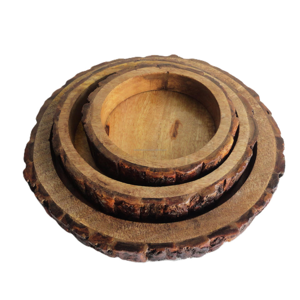ชุดชามไม้มะม่วง3ชิ้นรูปทรงกลมจานเสิร์ฟขนมและของหวานจากผู้ผลิตอินเดีย