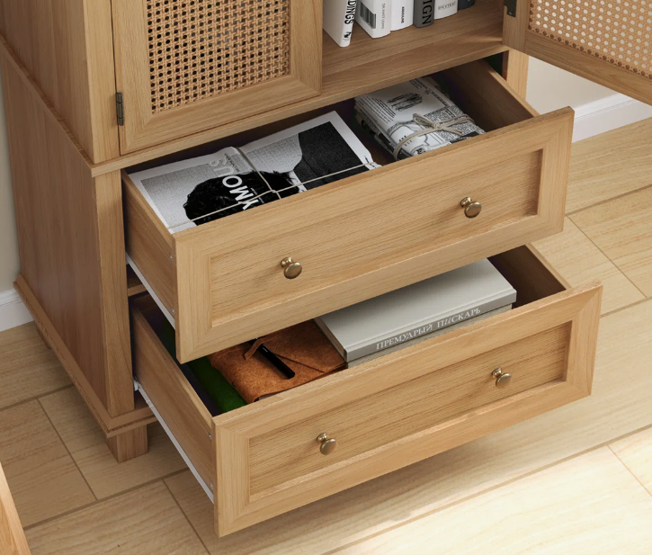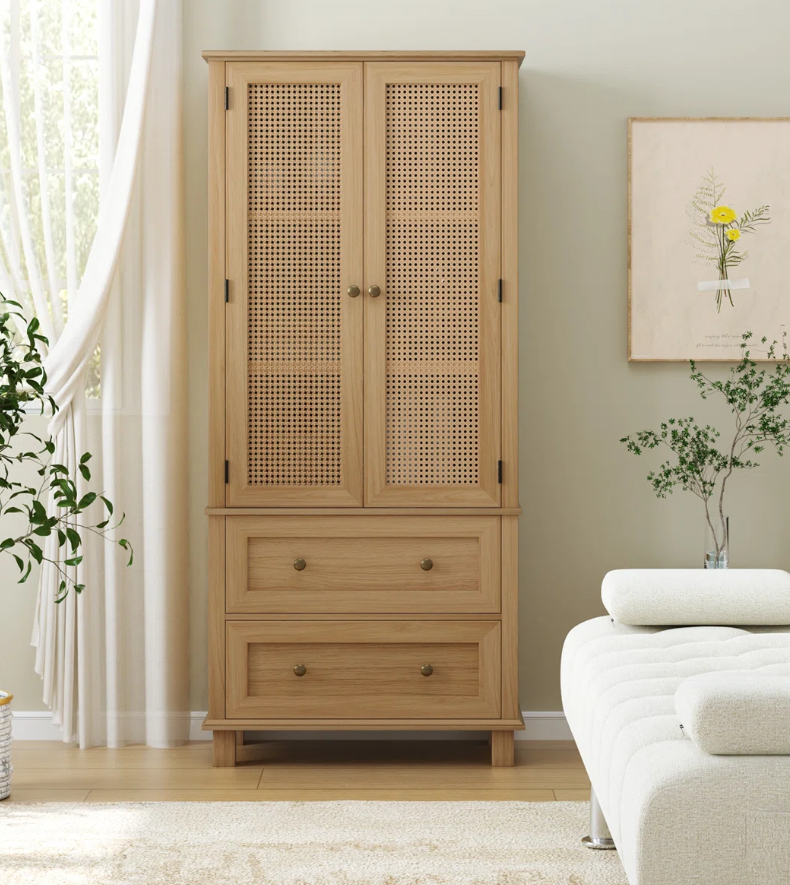 ตู้ไม้มะม่วงทรงสูงพร้อมบานประตูคู่และลิ้นชัก สีน้ำตาลสวยหรู พื้นที่จัดเก็บกว้างขวาง เหมาะสำหรับตกแต่งห้องนั่งเล่นและห้องนอน