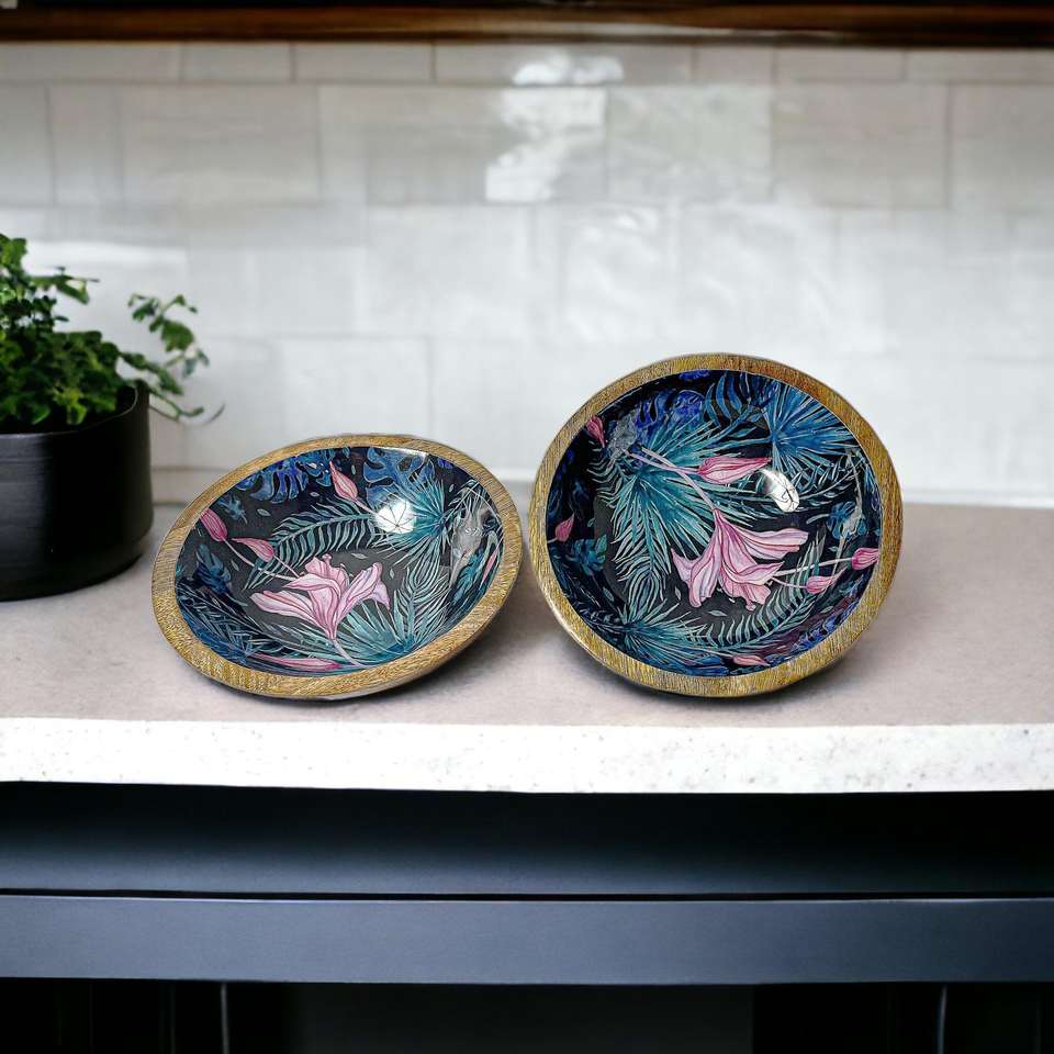 ชามไม้มะม่วงลายดอกไม้เคลือบ - ของตกแต่งโต๊ะอาหาร - เป็นมิตรกับสิ่งแวดล้อม - ชุดสองใบ