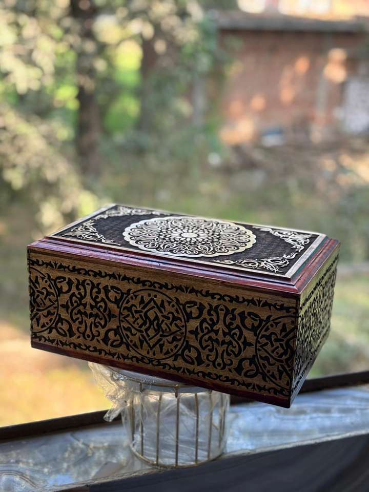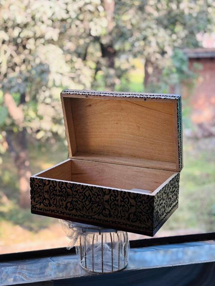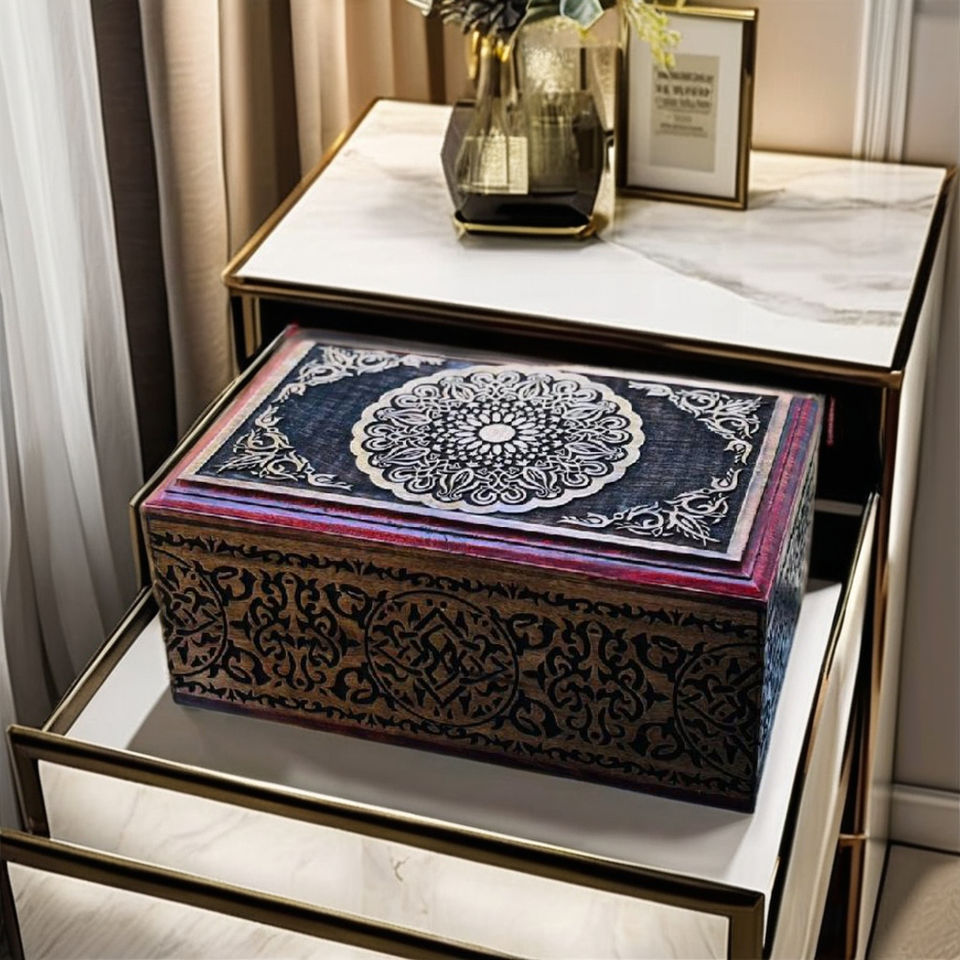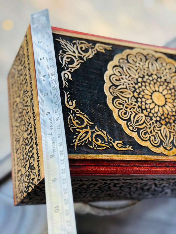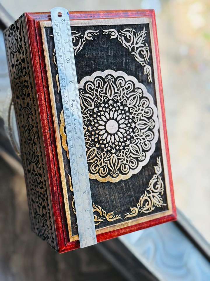 กล่องใส่เครื่องประดับไม้มะม่วงสลักลายเต็มใบ ขนาด 12.5 x 8.5 ซม. สำหรับสั่งซื้อจำนวนมาก กล่องไม้ขัดเงาสีทองและสีแดง กล่องจัดระเบียบเครื่องประดับไม้