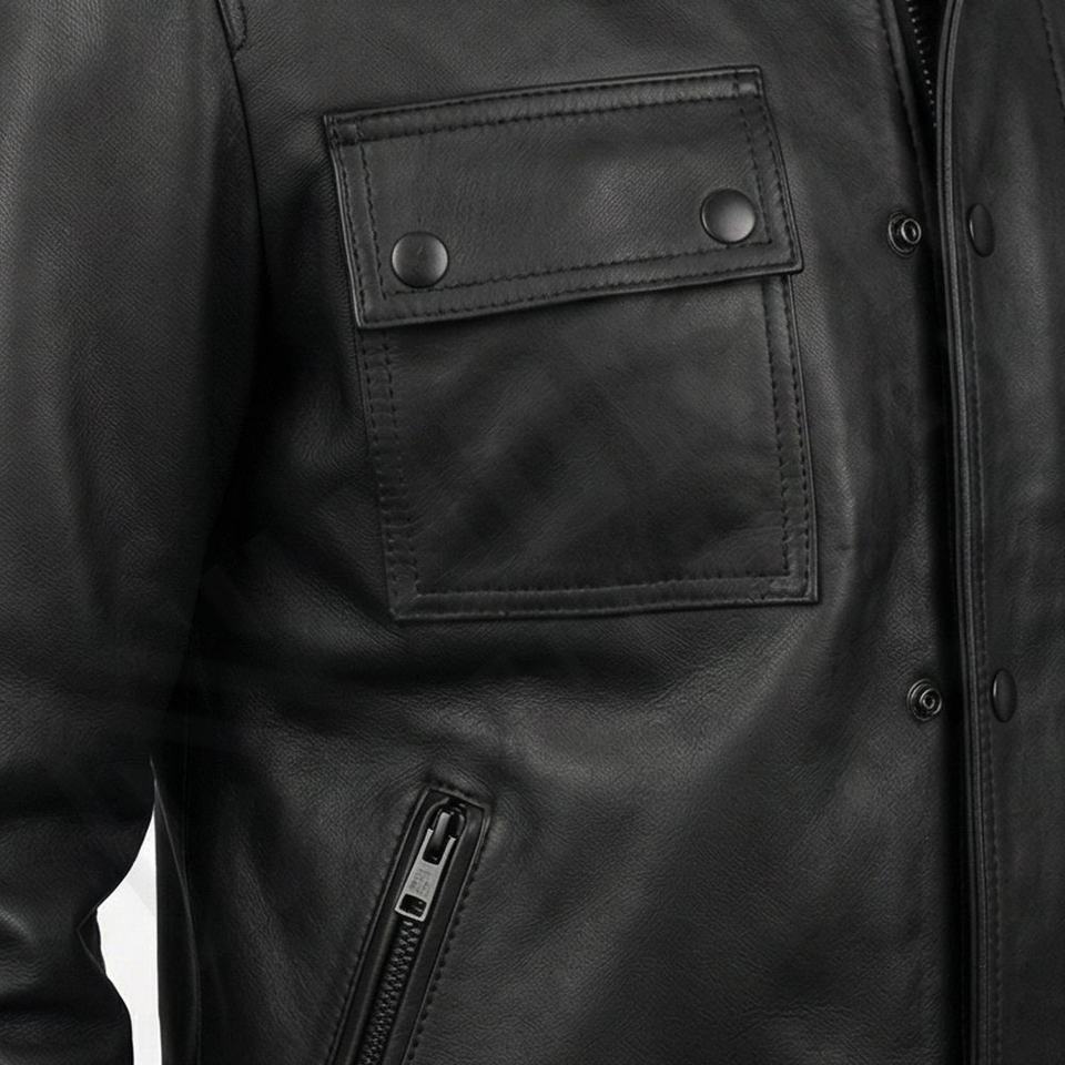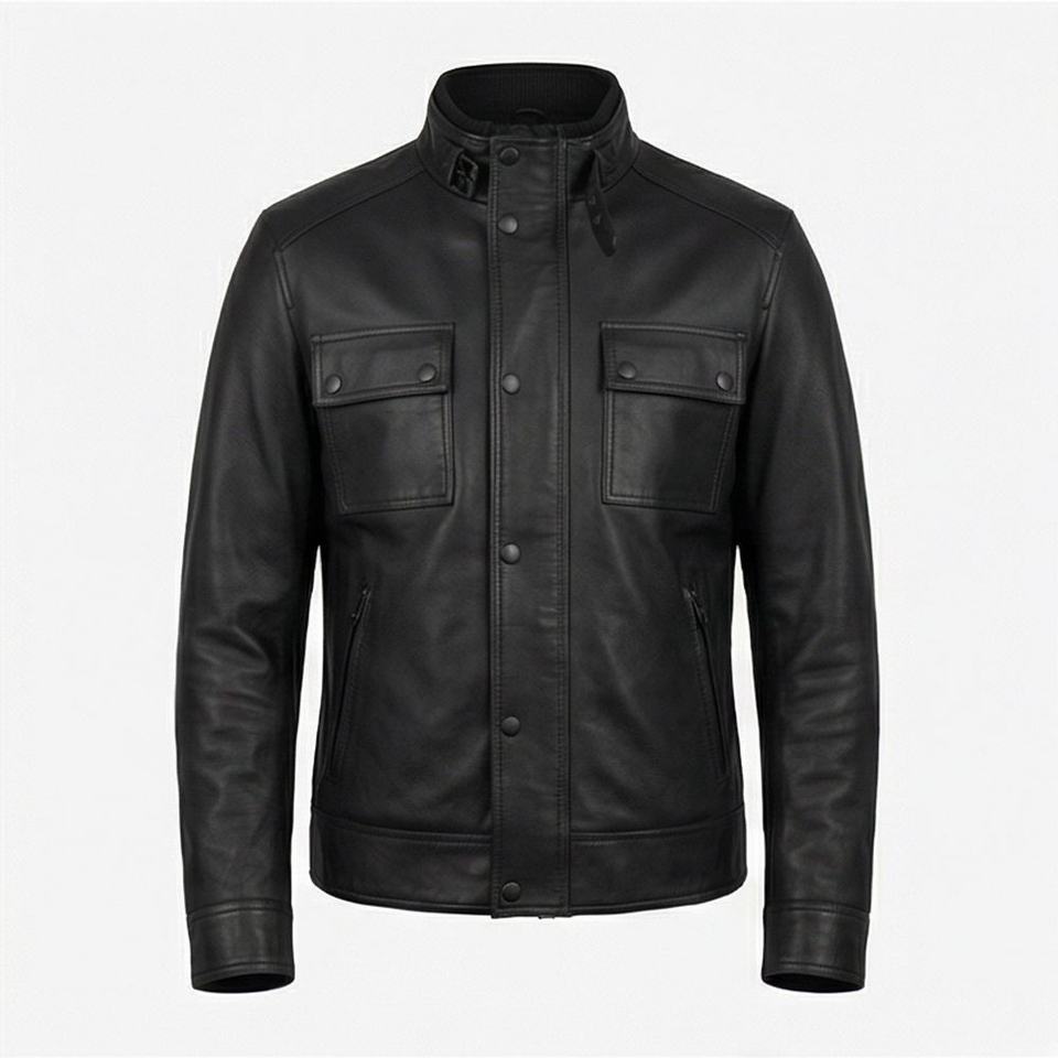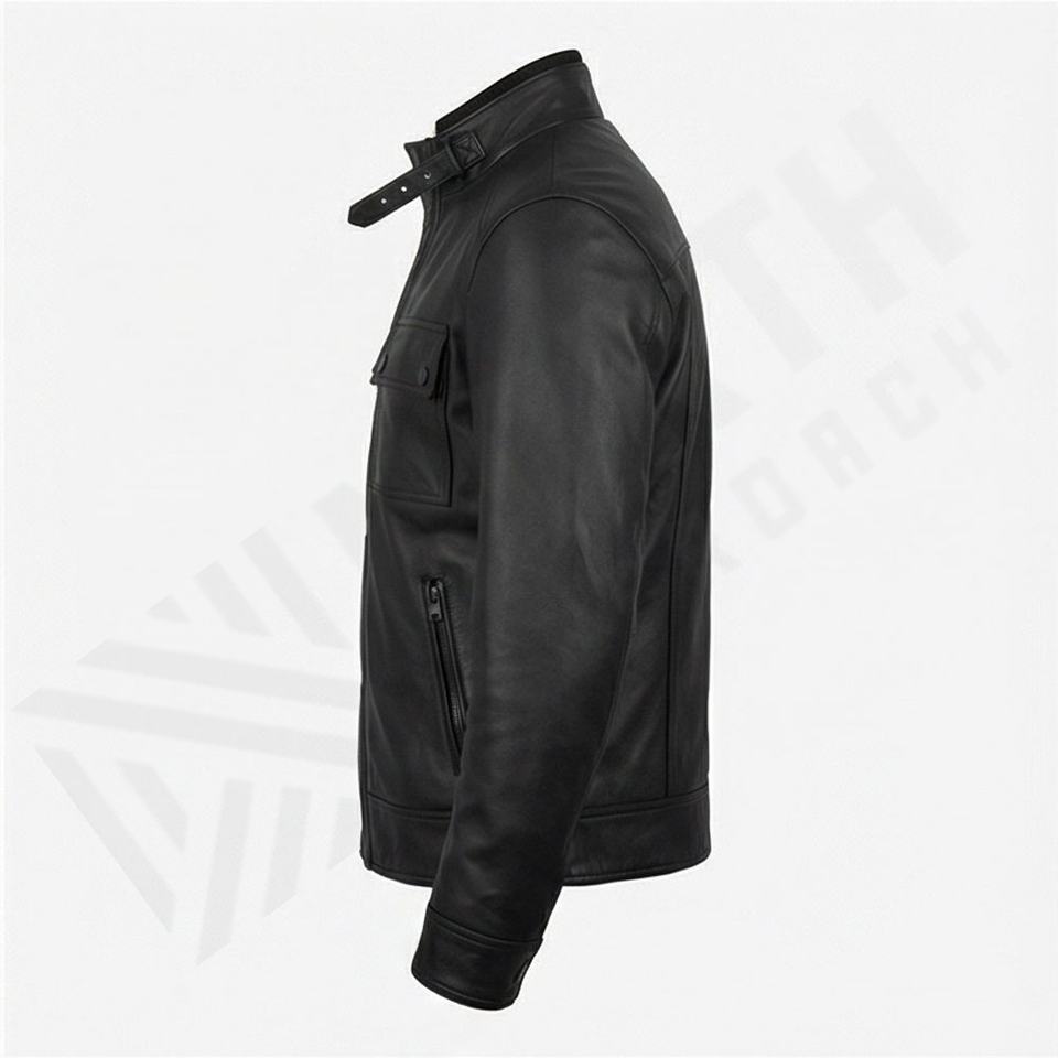 เสื้อแจ็คเก็ตหนังสไตล์ไบค์เกอร์สำหรับผู้ชาย ตกแต่งด้วยการเย็บแบบ Pull Up บุด้วยโพลีเอสเตอร์ พร้อมสายรัดแบบ Snap Belt สำหรับขี่มอเตอร์ไซค์ มีสีให้เลือกตามสั่ง