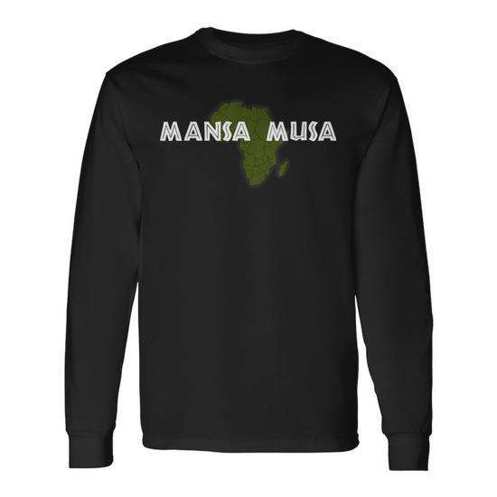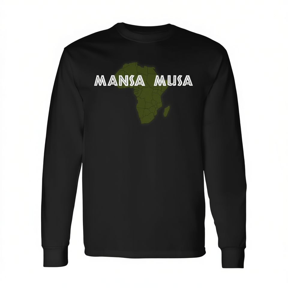 เสื้อยืดแขนยาวแมนซา มูซา ประวัติศาสตร์เดือนแห่งความรุ่งโรจน์ ดีไซน์แผนที่แอฟริกาสีดำ