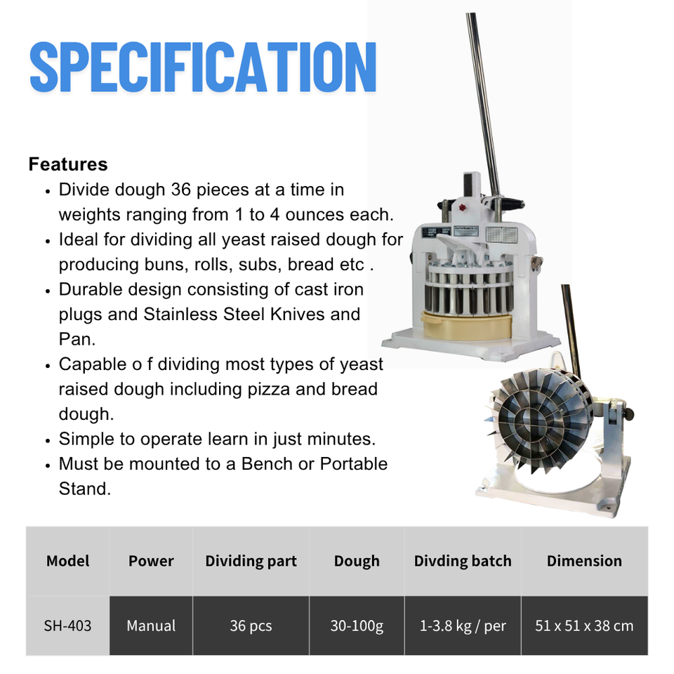 เครื่องแบ่งแป้งแบบมือหมุนสำหรับทำเบเกอรี่ เครื่องตัดแป้ง 30 กรัม - 100 กรัม เครื่องแบ่งแป้งแบบตั้งโต๊ะ 36 ชิ้น จากไต้หวัน