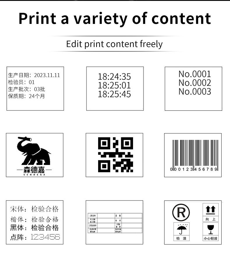 Printing content:number,bar code,QR code,character,pattern