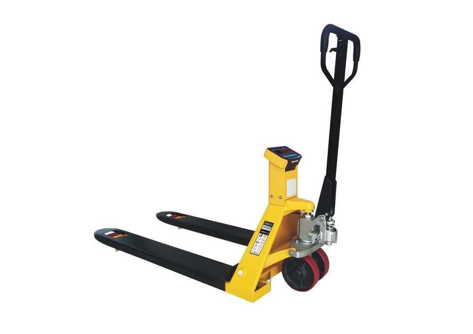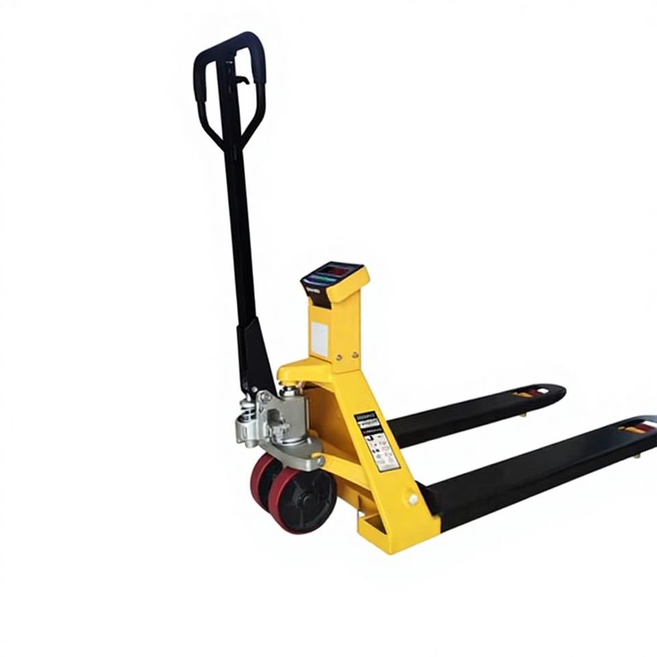รถยกพาเลทแบบแมนนวล รุ่น 2.5 ตัน พร้อมเครื่องชั่ง วัดความสูงงาตะเกียบ ล้อ PU/ยาง/ไนลอน สำหรับใช้งานกลางแจ้ง ผลิตในเวียดนาม