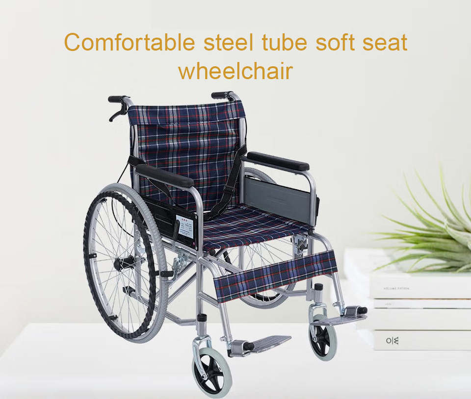 รถเข็นเหล็กน้ำหนักเบาแบบแมนนวลพร้อมยางนิวเมติกสำหรับผู้สูงอายุและโรงพยาบาลผู้พิการใช้กายภาพบำบัด