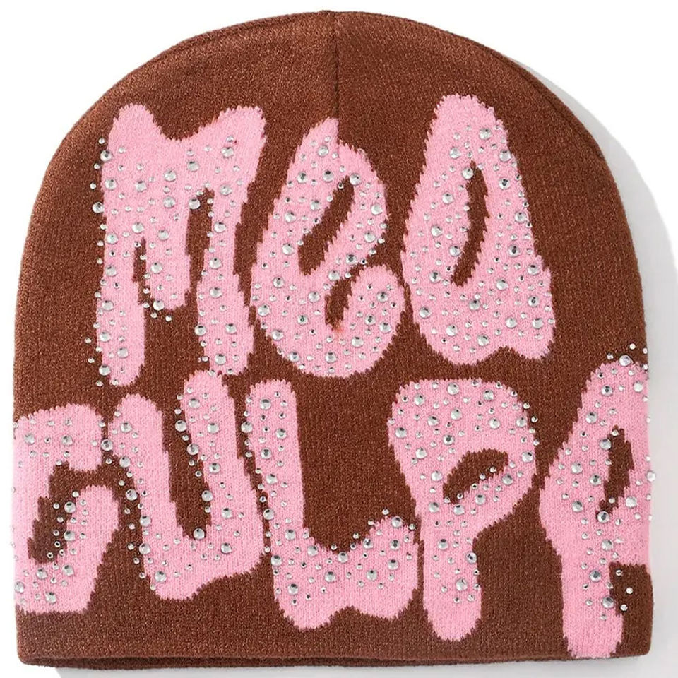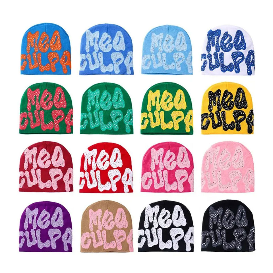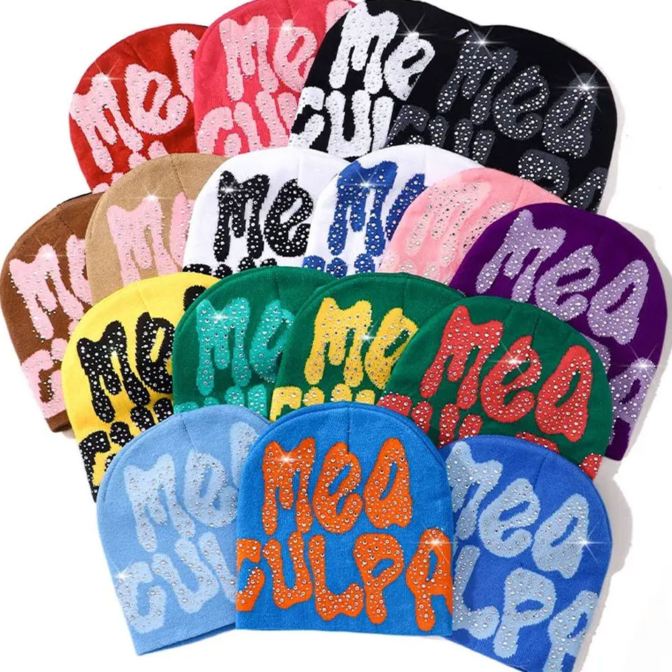 หมวกไหมพรมถักสำหรับผู้ชายและผู้หญิงหมวกบีนนี่พลอยเทียมทรงโอเวอร์ไซส์สำหรับฤดูหนาว