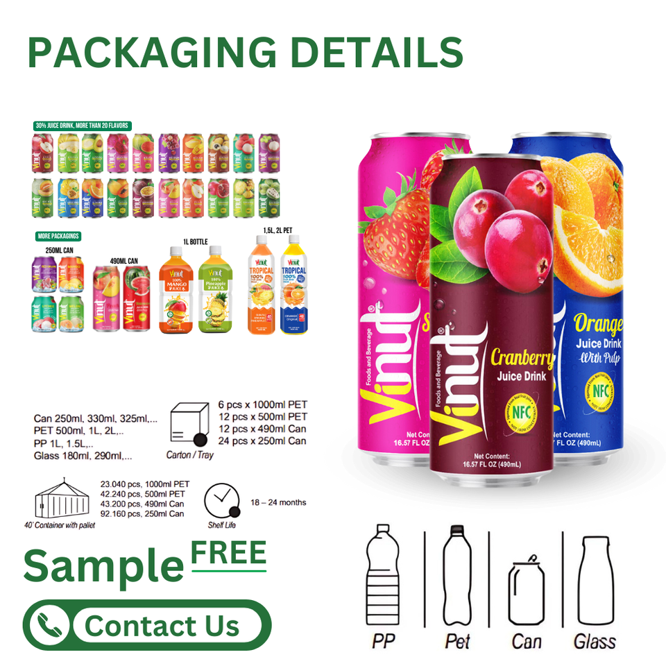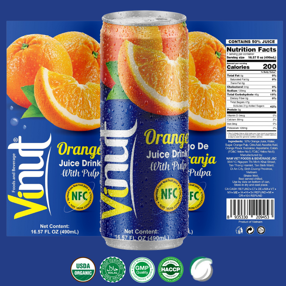 ผลิตเครื่องดื่มจากเวียดนาม-100% น้ำผลไม้เมืองร้อน490มล. น้ำผลไม้สีส้มบรรจุกระป๋องพร้อมเยื่อตัวอย่างฟรีฉลากส่วนตัว