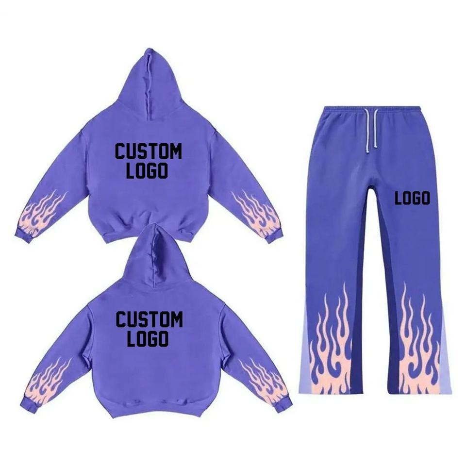 ชุดวอร์มผ้าฝ้าย100% มีฮู้ดผ้าพัมพ์สูทกางเกงสแต็คทรงบ็อกซี่พิมพ์โลโก้ได้ตามต้องการ