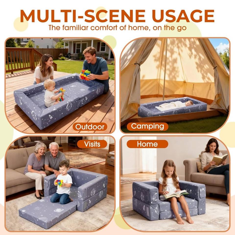 เตียงเด็กอ่อนพกพา 3-in-1 แบบพับเป็นโซฟาได้ พร้อมโฟมความหนาแน่นสูง สำหรับการตั้งแคมป์และการใช้งานในร่ม/กลางแจ้ง