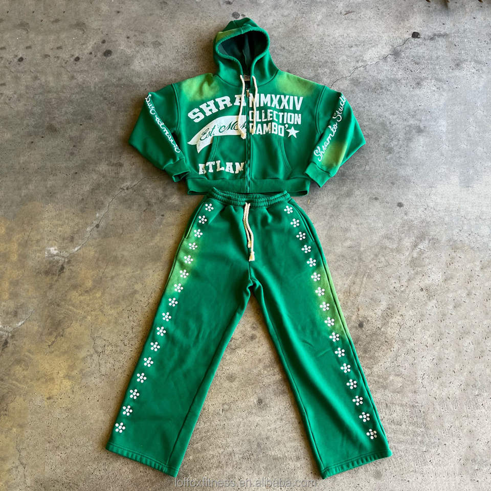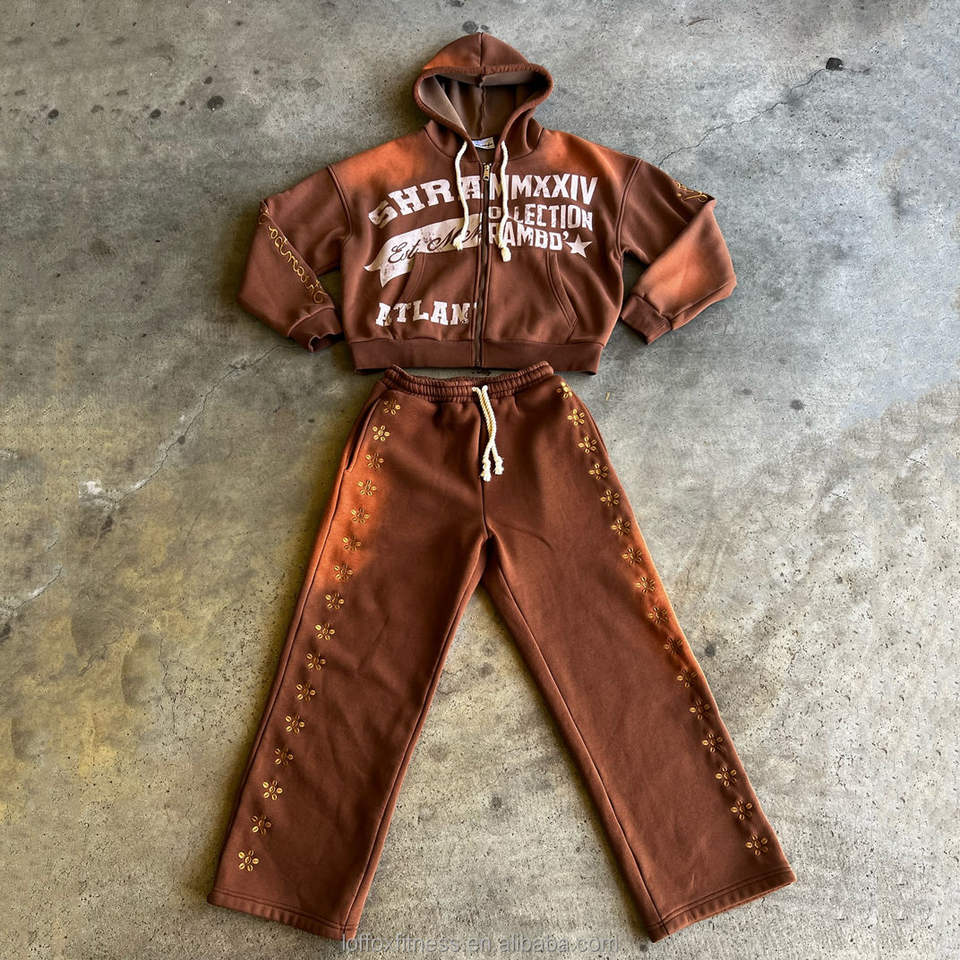 ชุดวอร์มลำลองแบบมีฮู้ดผ้าฝ้ายเฟรนช์เทอร์รี่เนื้อหนัก ตกแต่งด้วยแพทช์ปัก จากผู้ผลิต พร้อมเชือกผูกเอวและกางเกงขายาว