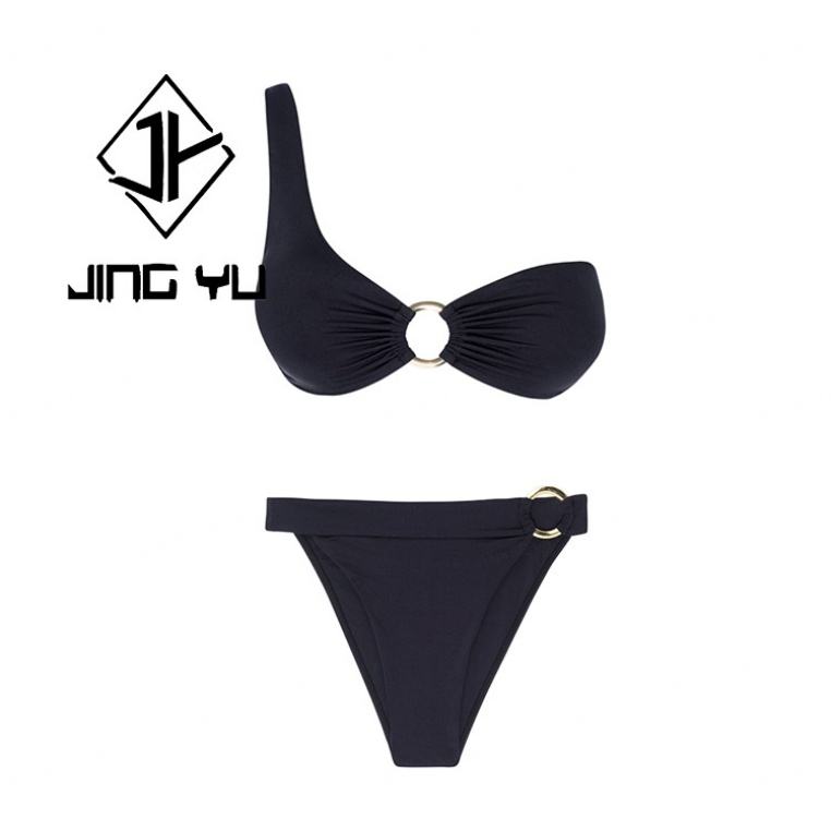 ชุดว่ายน้ำผ้าไนลอนรีไซเคิลชุดบิกินี่สองชิ้นมีห่วงสีทองเปิดไหล่ข้างเดียวสีดำ