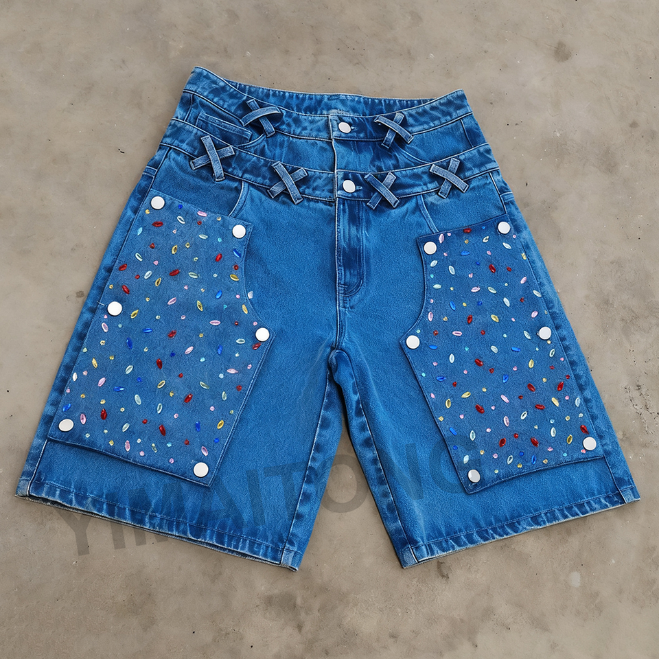 กางเกงยีนส์ขาสั้นสำหรับผู้ชายกางเกงขาสั้นผ้ายีนส์ทรงแบ็กกี้มีเพชรประดับพลอยเทียมแฟชั่นออกแบบได้ตามต้องการ