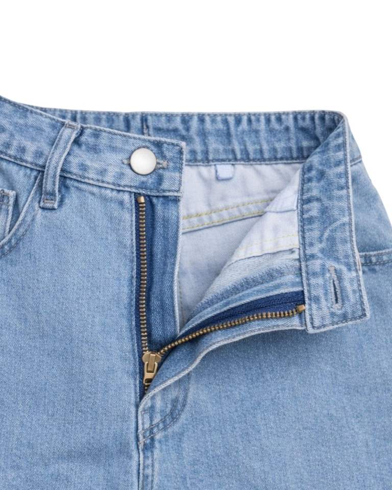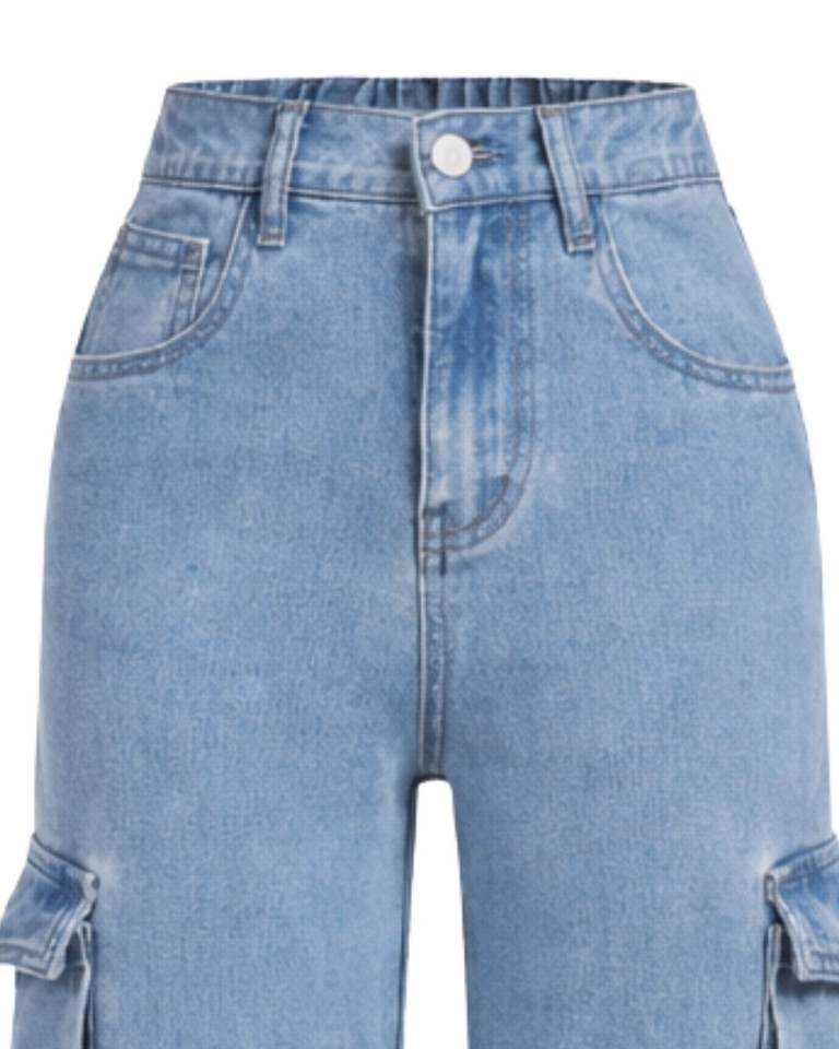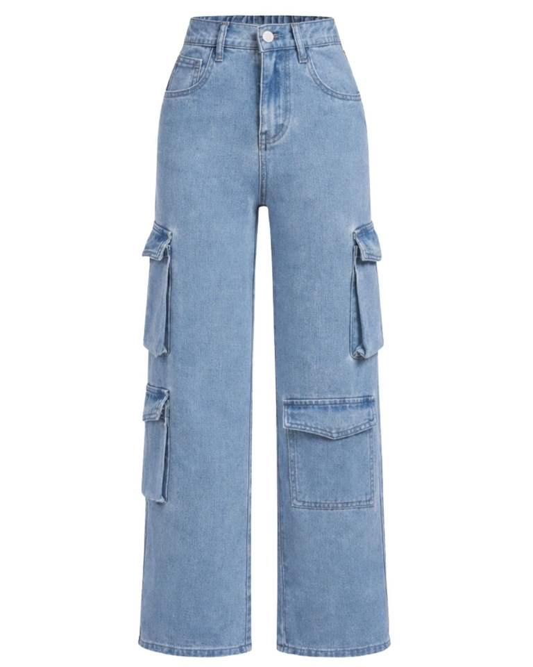 กางเกงยีนส์คาร์โก้สีฟ้าอ่อนแบบสั่งทำสำหรับผู้หญิง เอวสูง หลายกระเป๋า ทรงขากว้าง หลวม สไตล์สตรีทแวร์ลำลอง