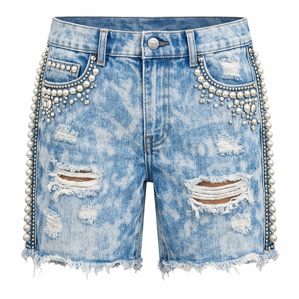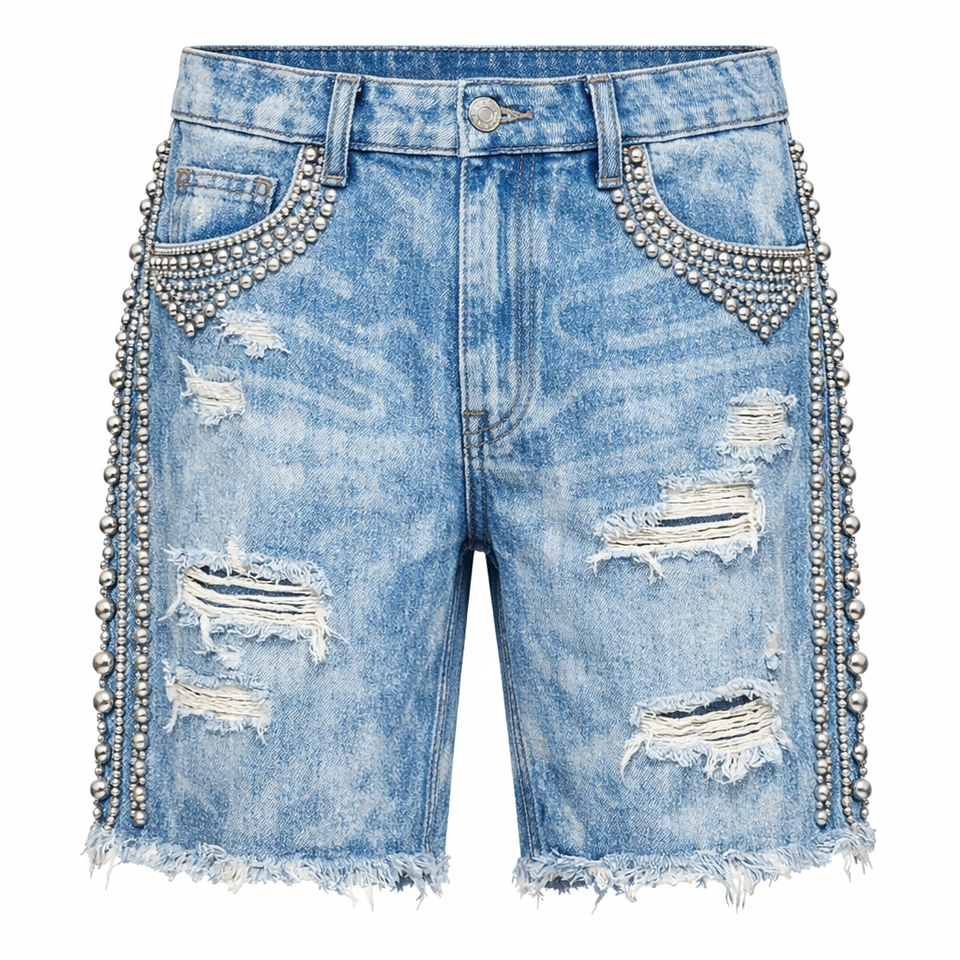 กางเกงยีนส์ขาสั้นเดนิมทรงตรงสไตล์วินเทจ Y2K สตรีทแวร์ แต่งคริสตัล ขาสองชั้น ล้างสีแบบแอซิดวอช รับทำโลโก้ตามสั่งสำหรับผู้ชาย