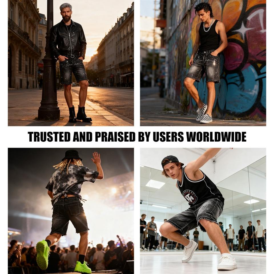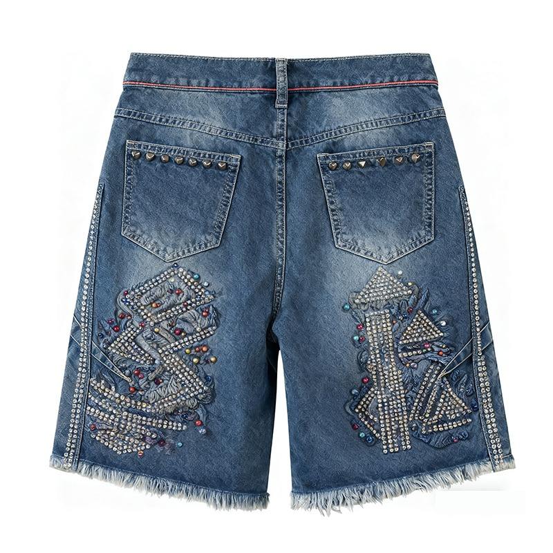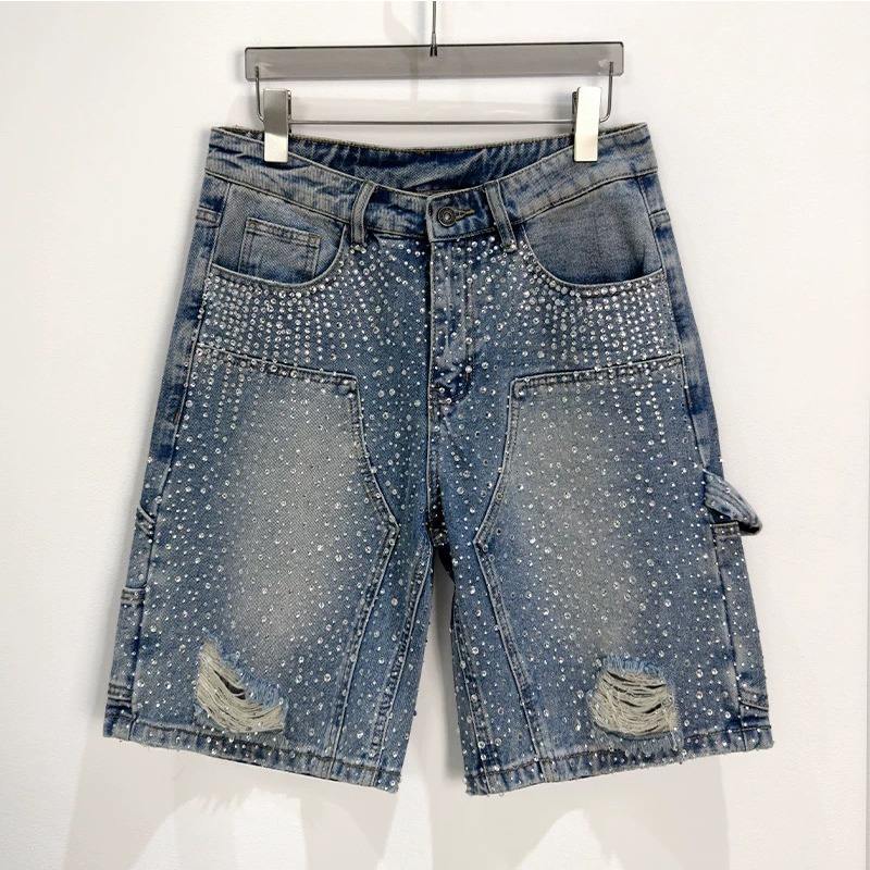 กางเกงยีนส์ขาสั้นทรงคาร์โก้ผู้ชายสั่งทำพิเศษจากโรงงาน ดีไซน์ทันสมัย เอวสองชั้น ประดับหมุดและคริสตัลที่เข่า ทรงหลวม คุณภาพสูง สีพื้น