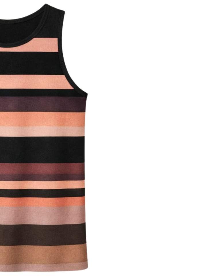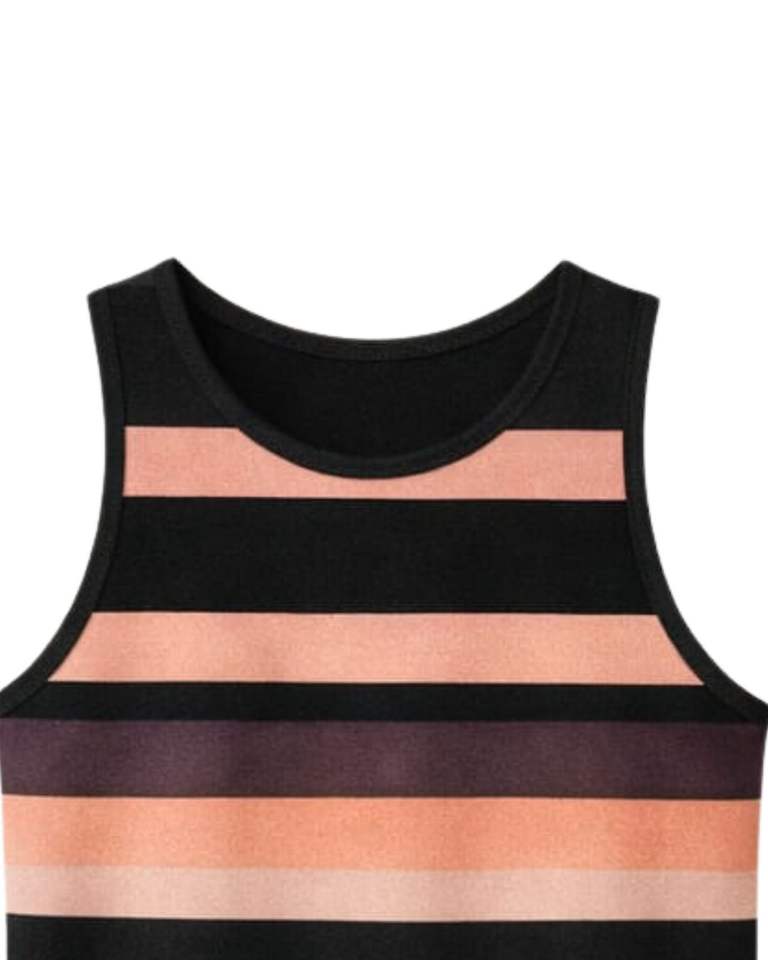เสื้อกล้ามผู้ชายสีดำลายทางสีน้ำตาลพีช แบบคัสตอมจากผู้ผลิต คอกลม แขนกุด สวมใส่สบาย ระบายอากาศได้ดี เหมาะสำหรับออกกำลังกายในฤดูร้อน