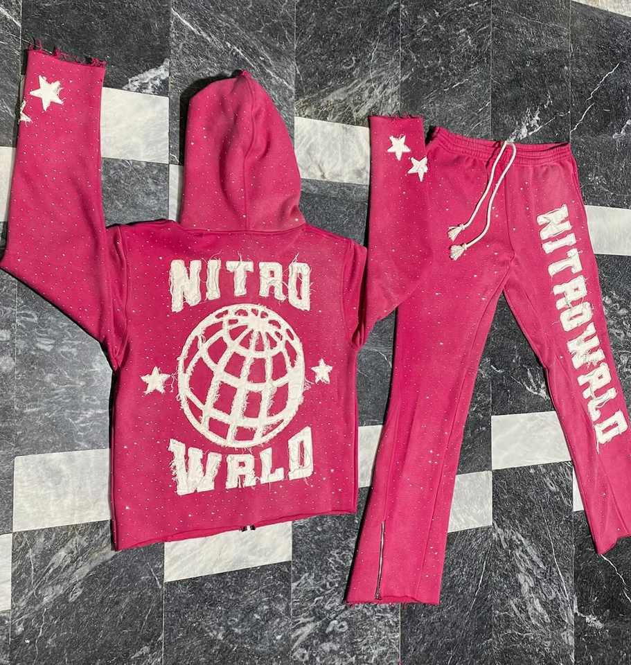 ชุดเสื้อฮู้ดมีซิปเต็มหน้าสำหรับผู้ชายกางเกงวอร์มมีฮู้ดแบบมีซิปติดพลอยเทียมออกแบบได้ตามต้องการ